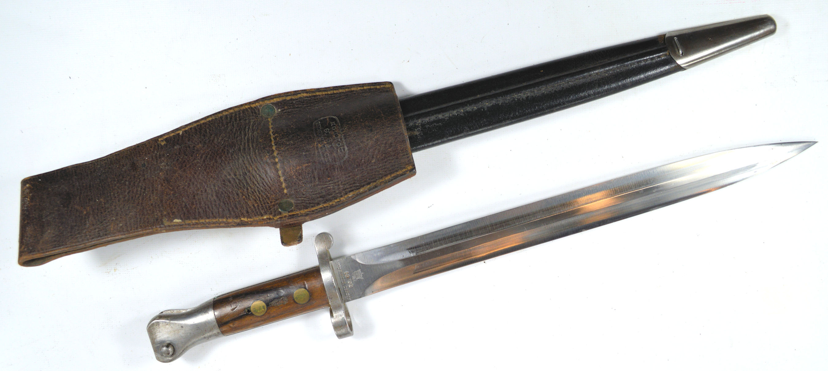 - A good clean example of a P1888 Mk.III bayonet by Sanderson of Sheffield and dated February 1903. Complete with a Mk.I scabbard and a General Service brown leather frog.
