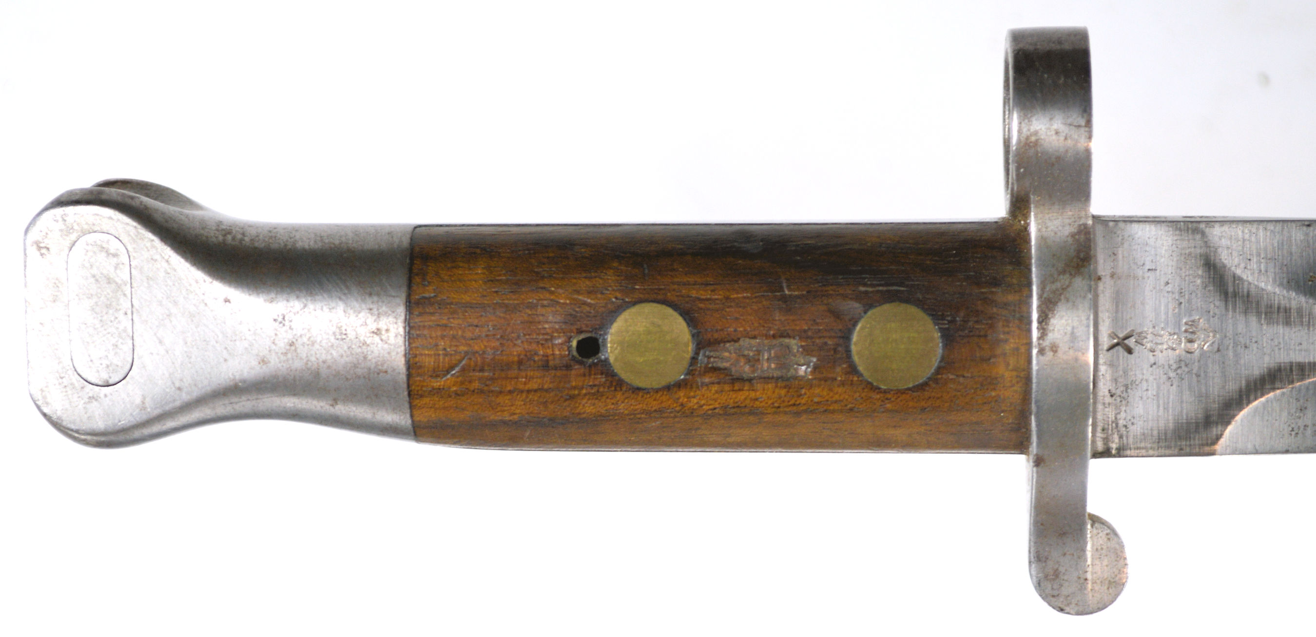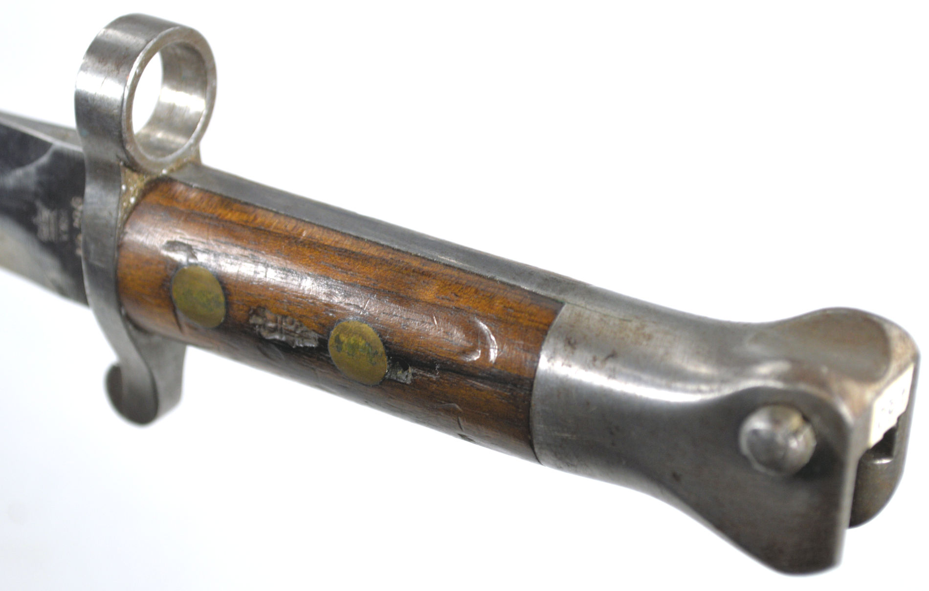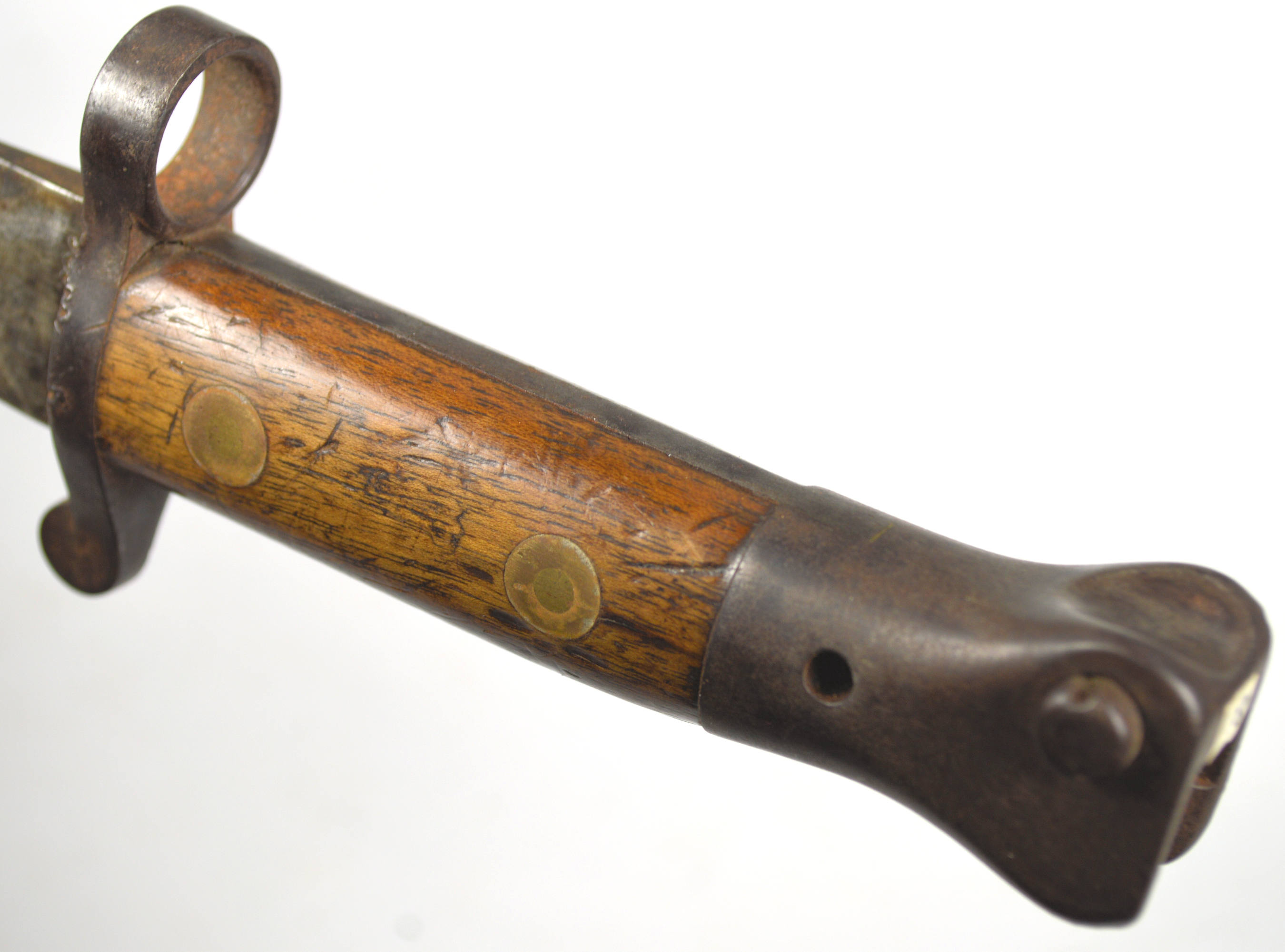 - A yataghan sword bayonet with a lug and short bat hilt fitting, heavily modified. The crossguard quillons have been removed,