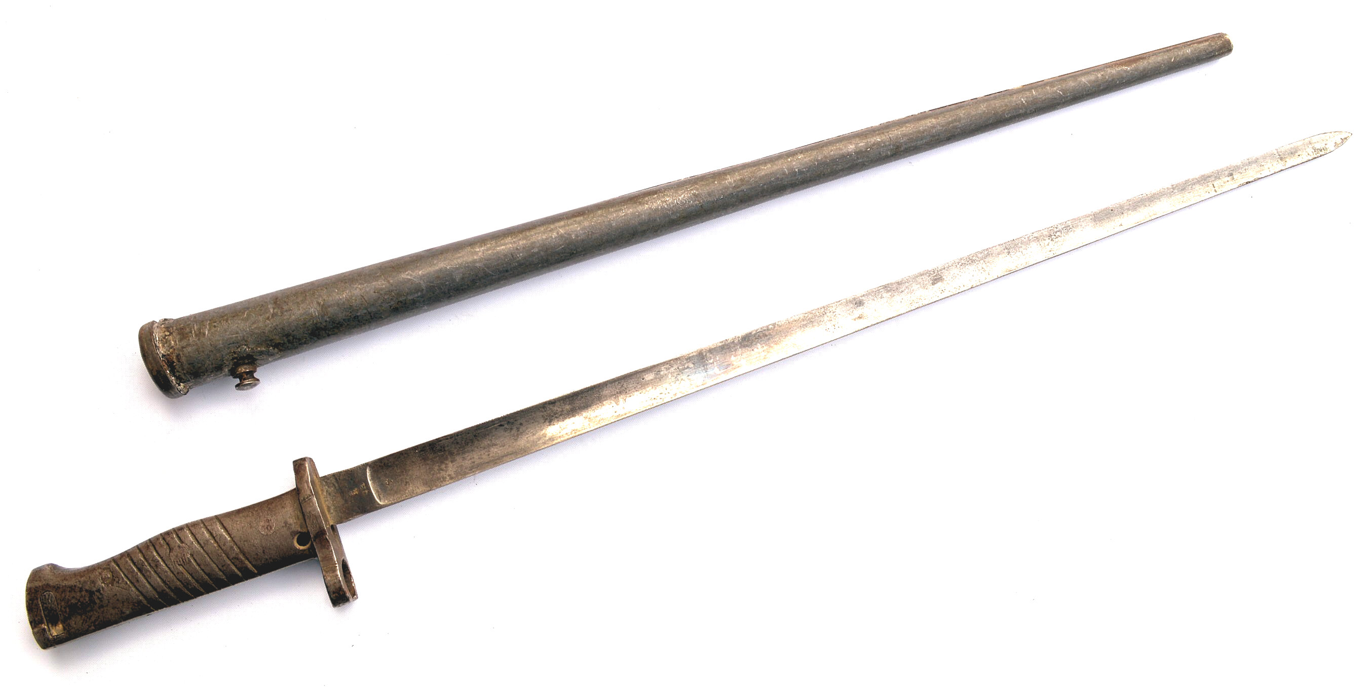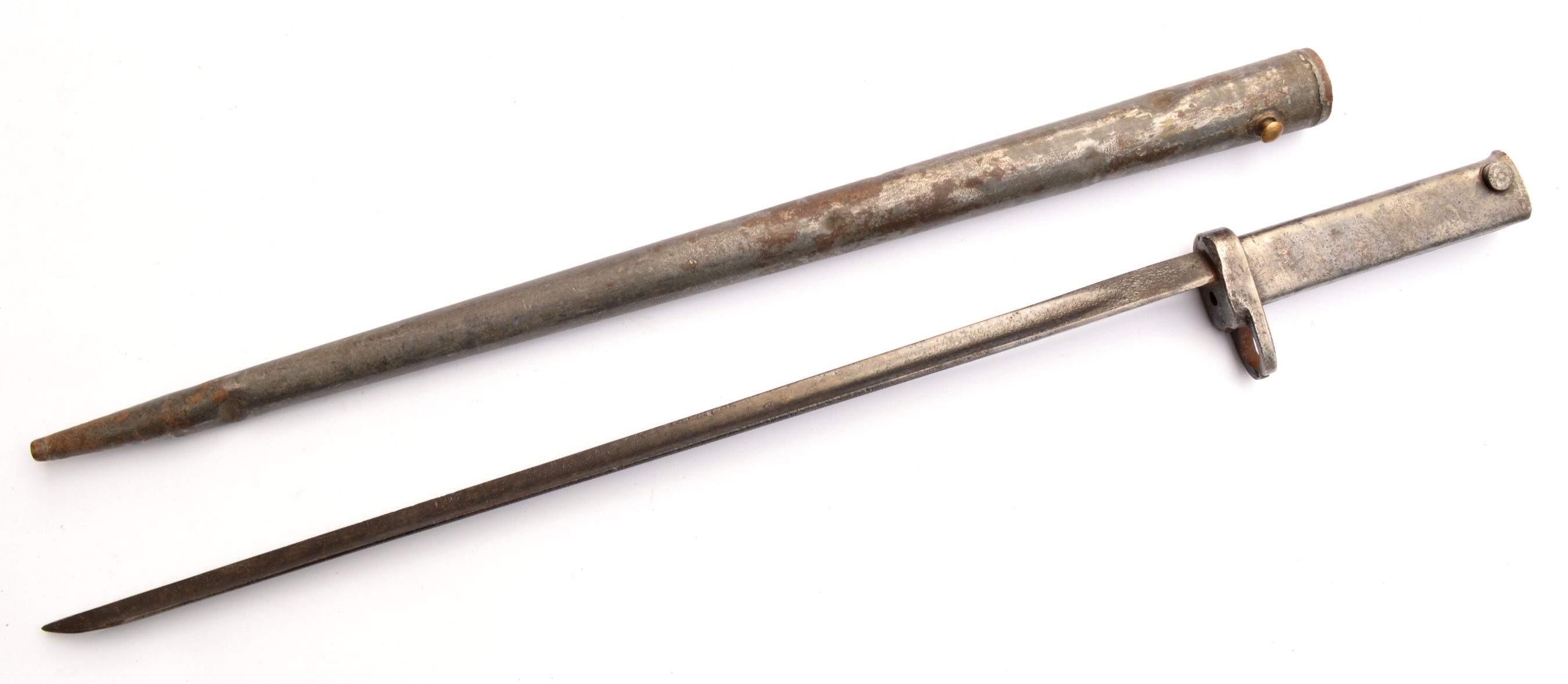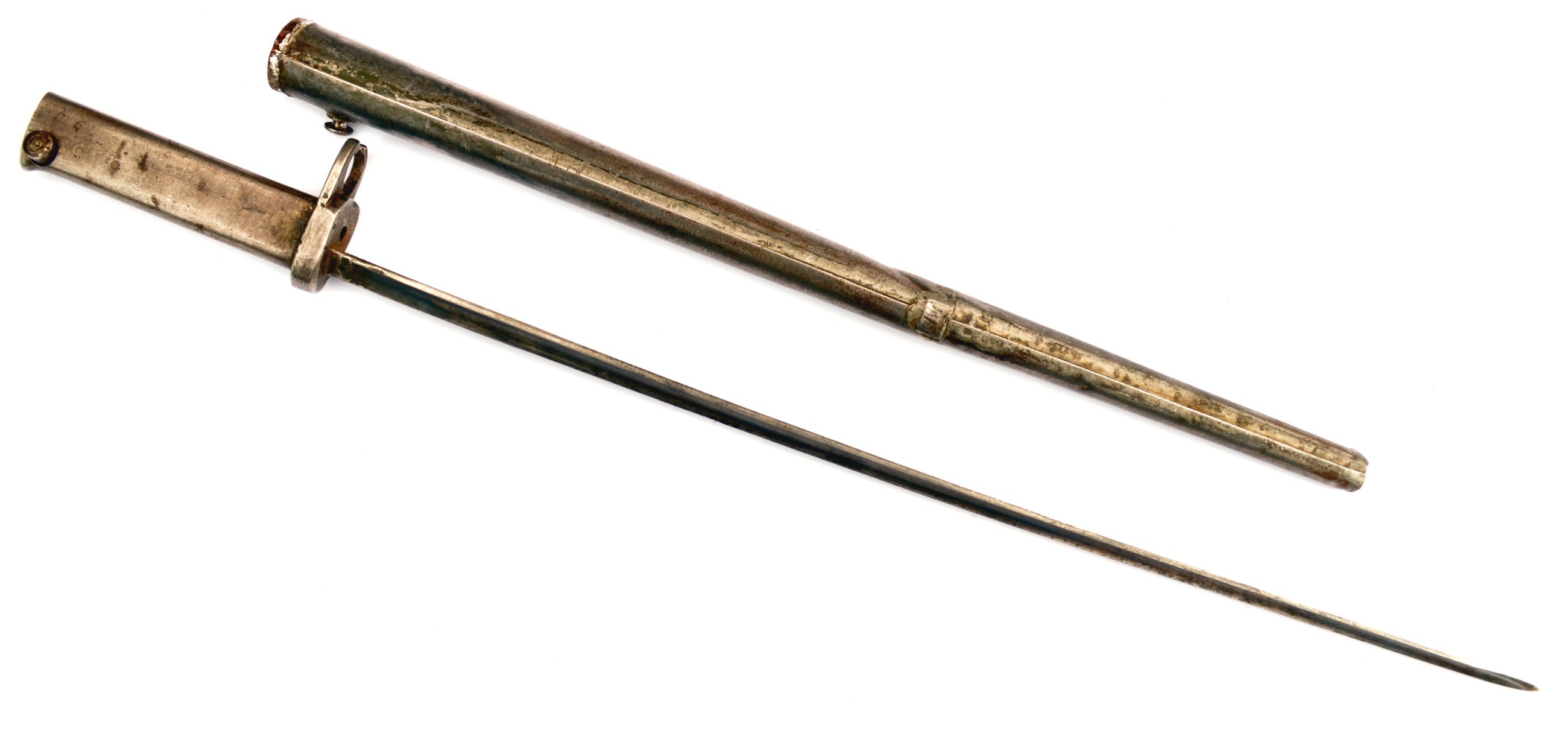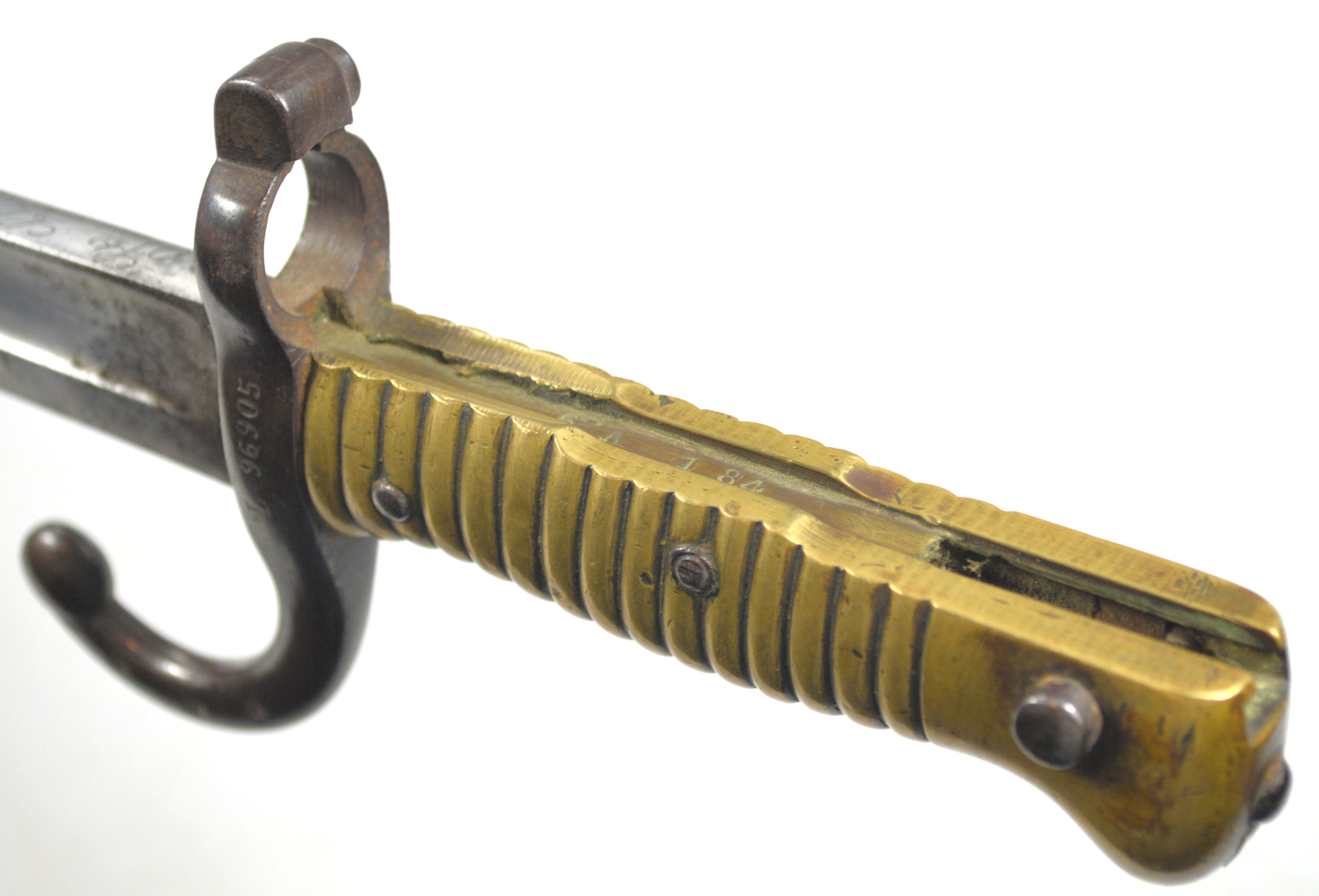 - A French M1866 sword bayonet with serial number matching scabbard. Modified to fit Gew88. Not a Cahen-Lyon supplied bayonet, but one