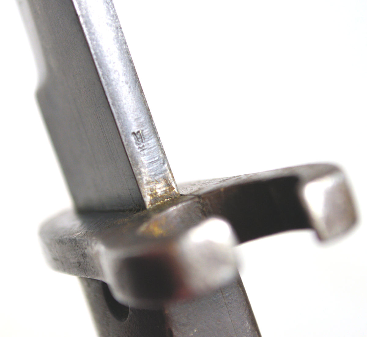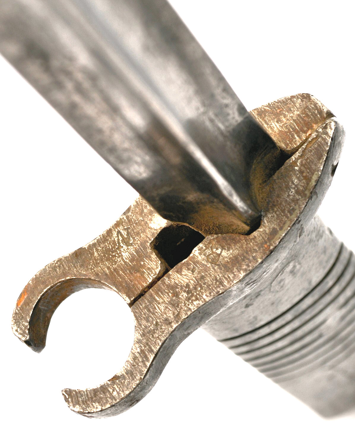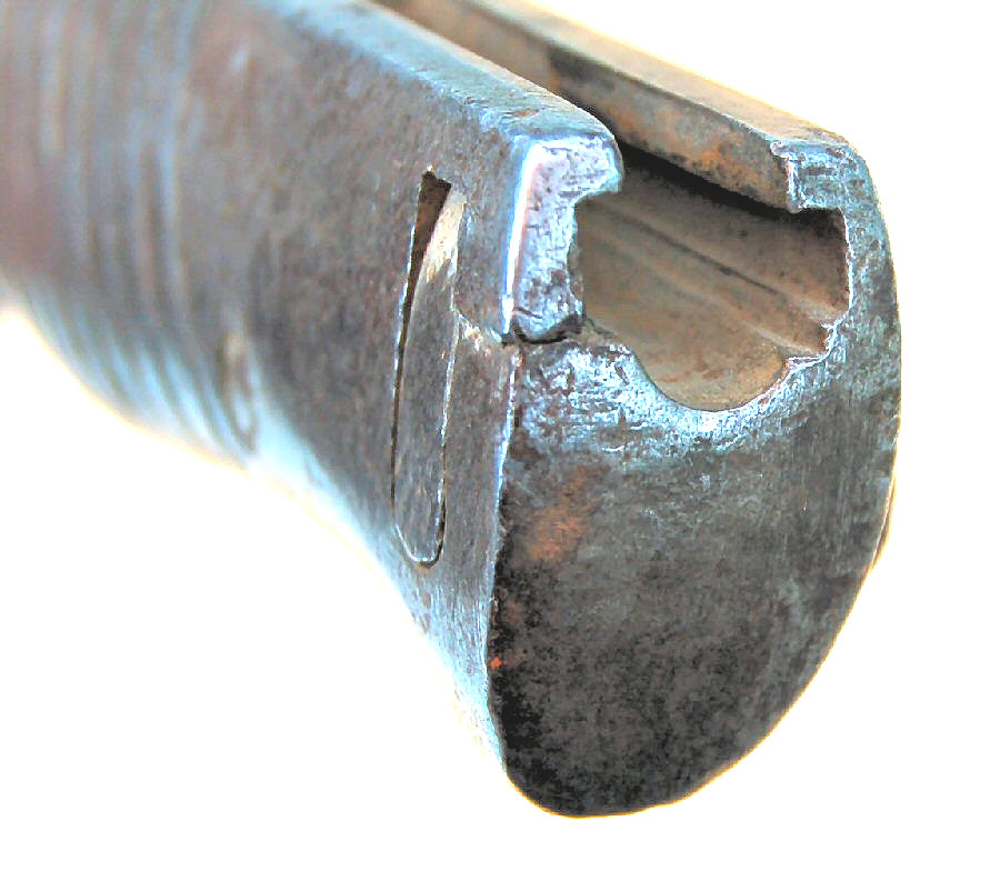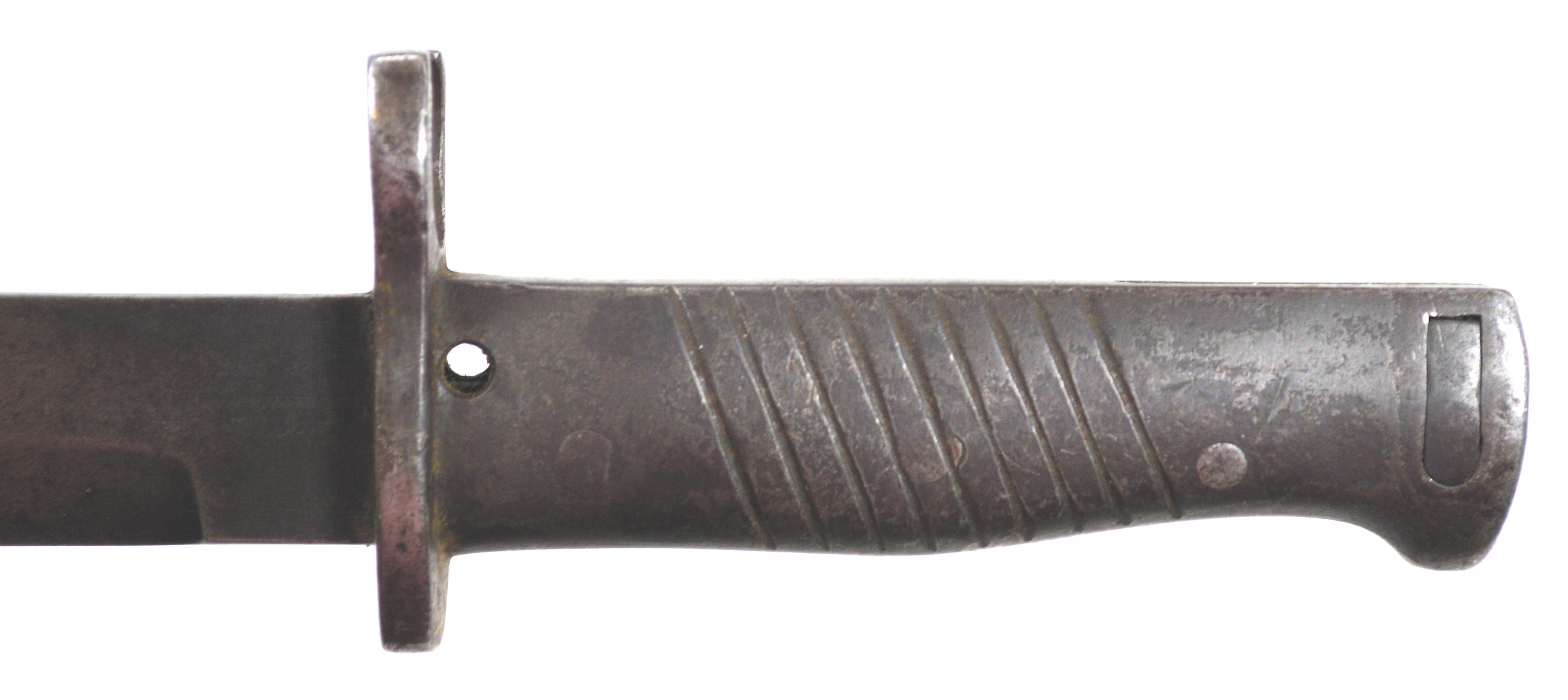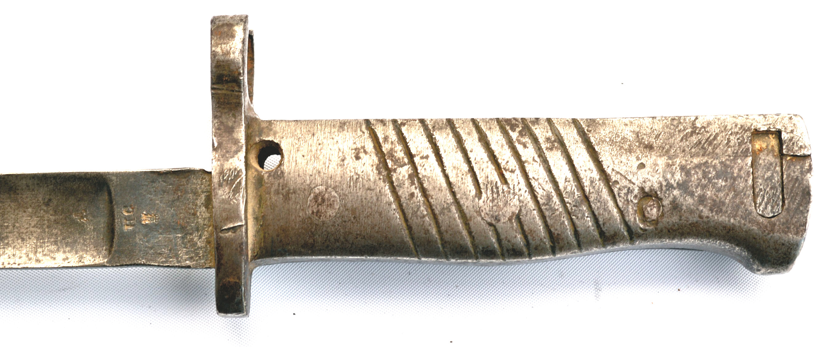 - Ersatz knife bayonet. A cast steel hilt with a sharp beak and raised re-inforcement around the locking catch.