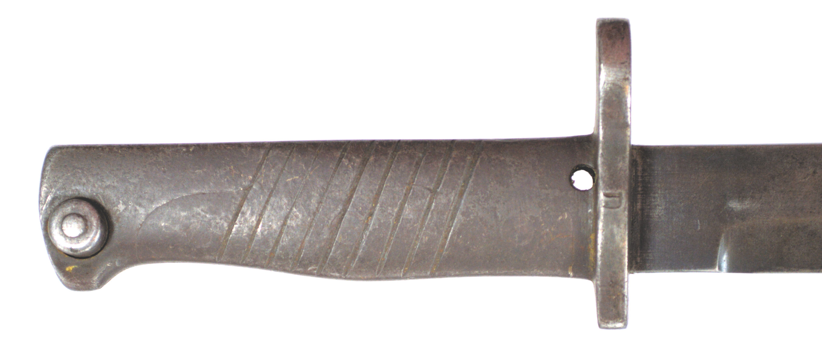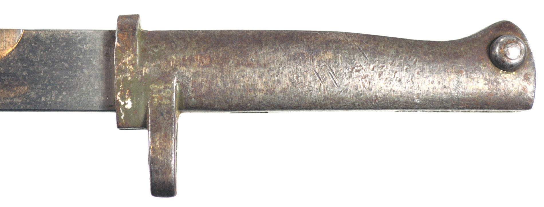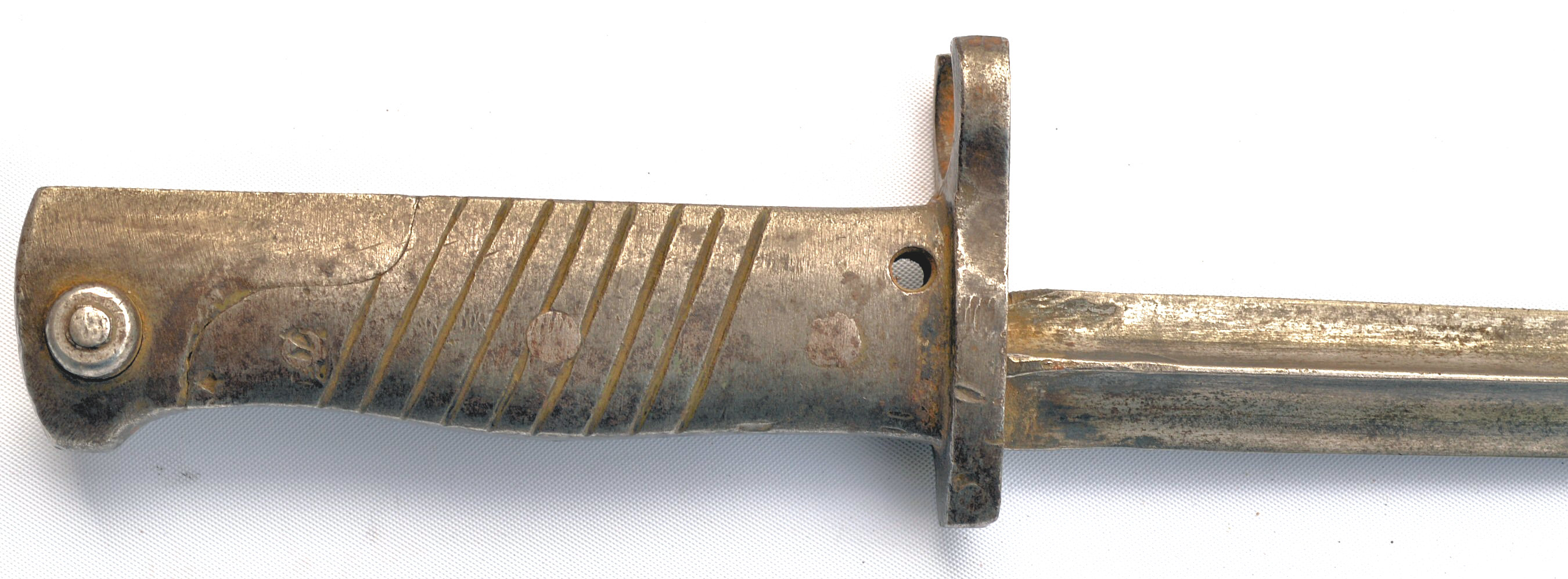 - An ersatz knife bayonet with a cast steel hilt and a rounded pommel with no re-inforcement around the locking catch.
