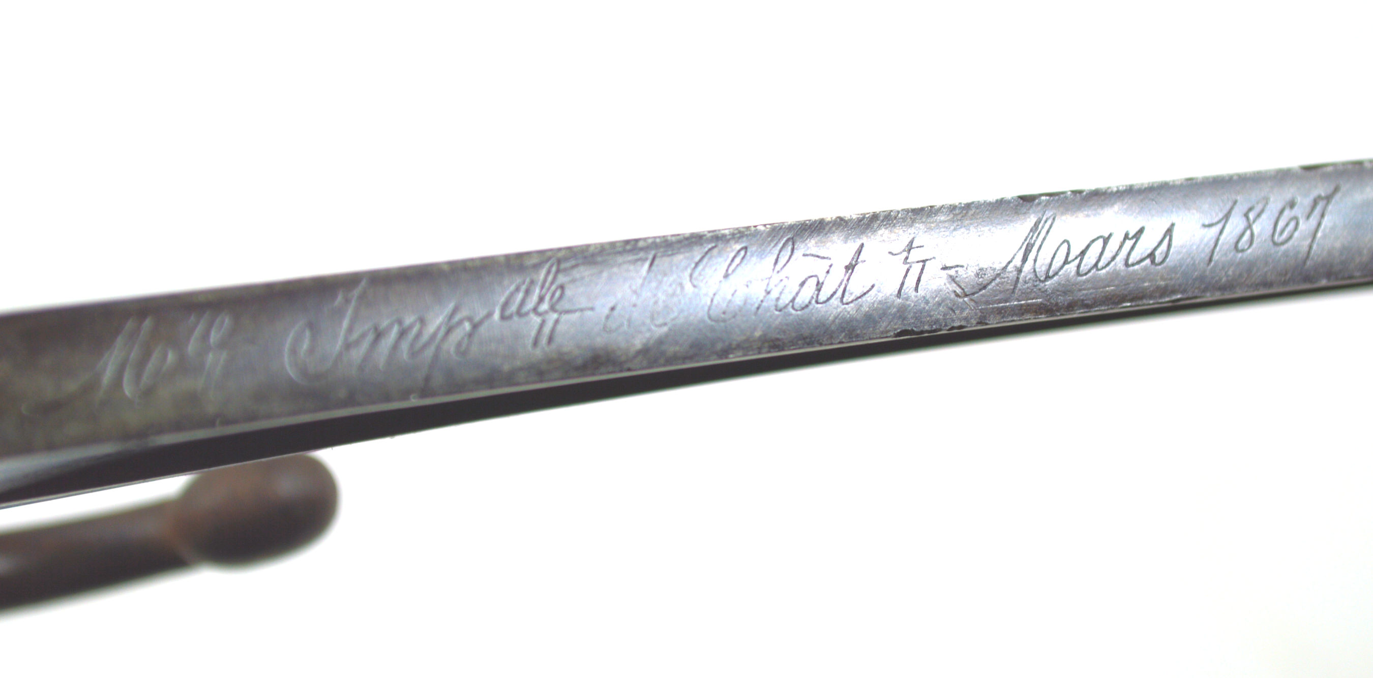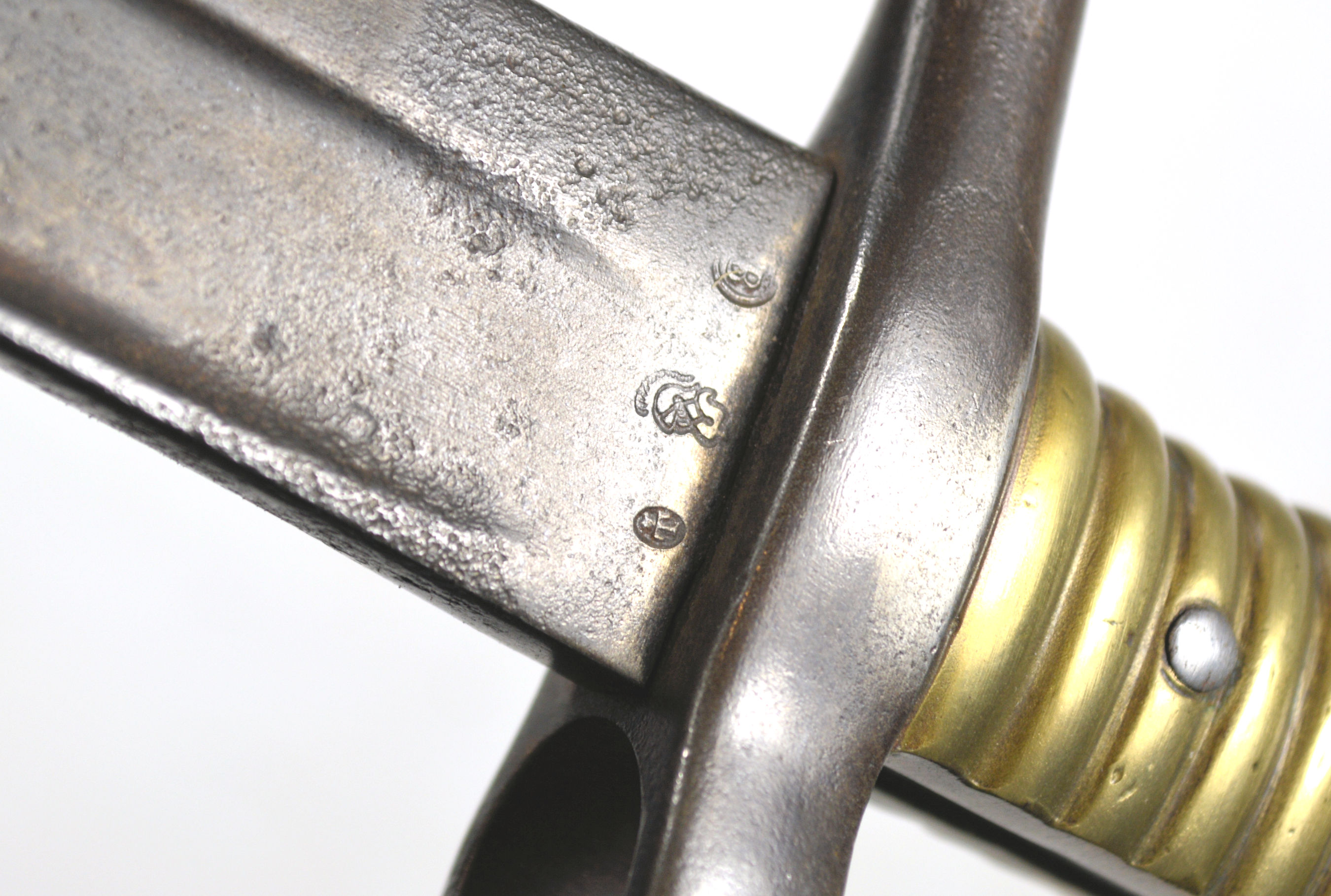 Good history to this piece. Right ricasso: French inspection marks. Back of blade: St. Etienne Juin 1869.