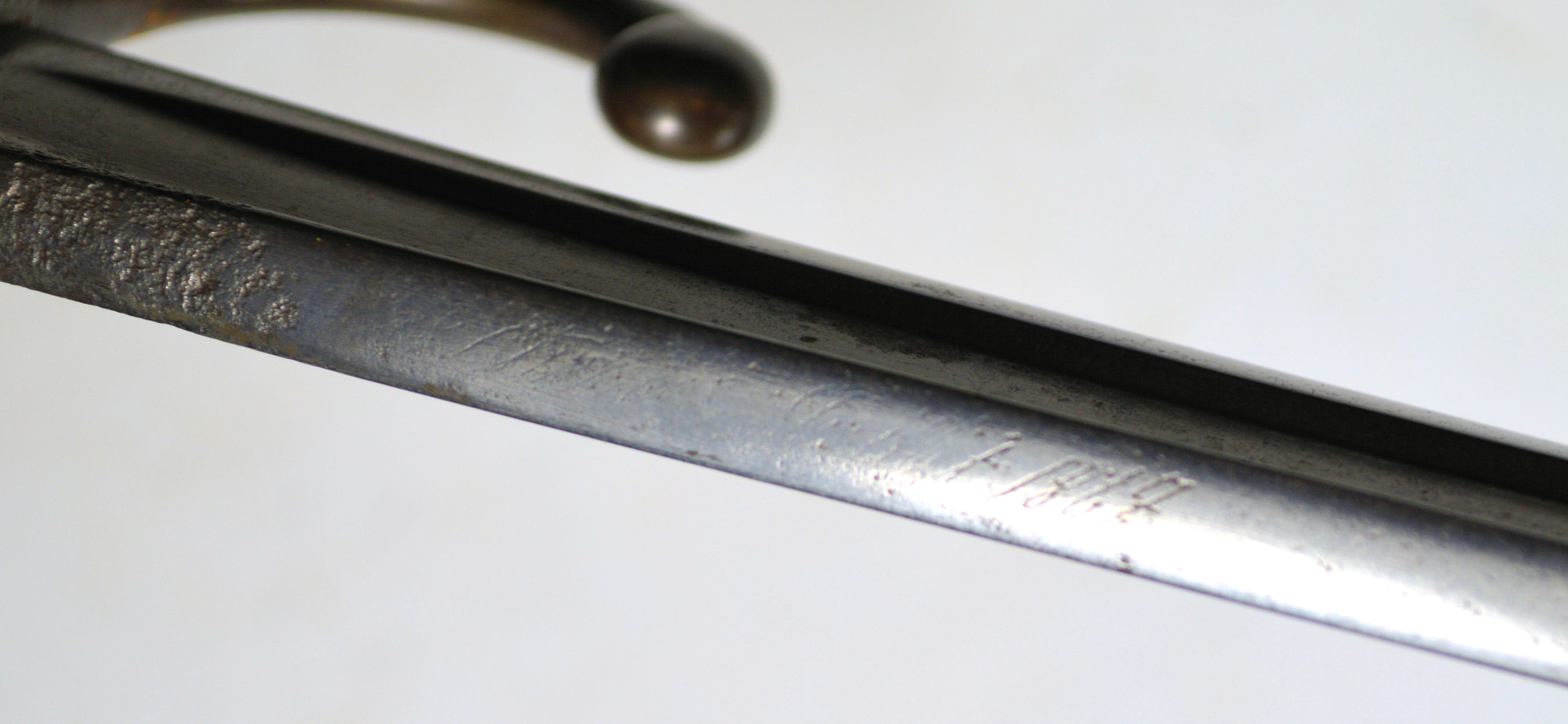 A single edge blade with a wide fuller variation, with crown/R fraktur.