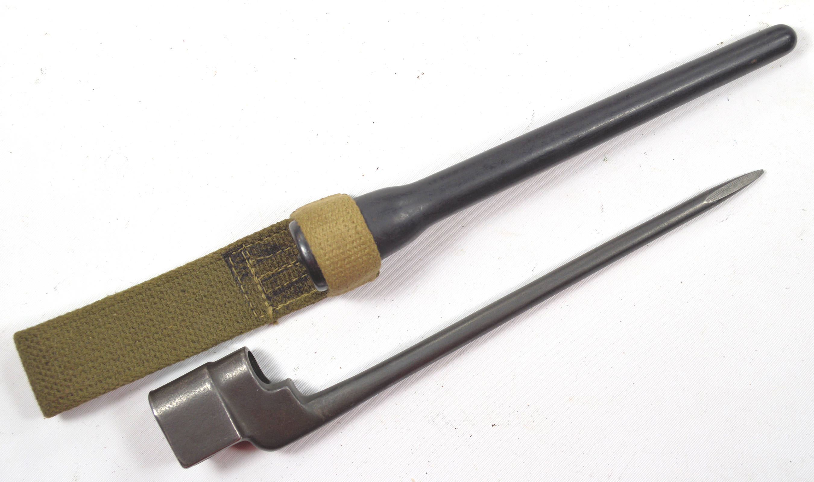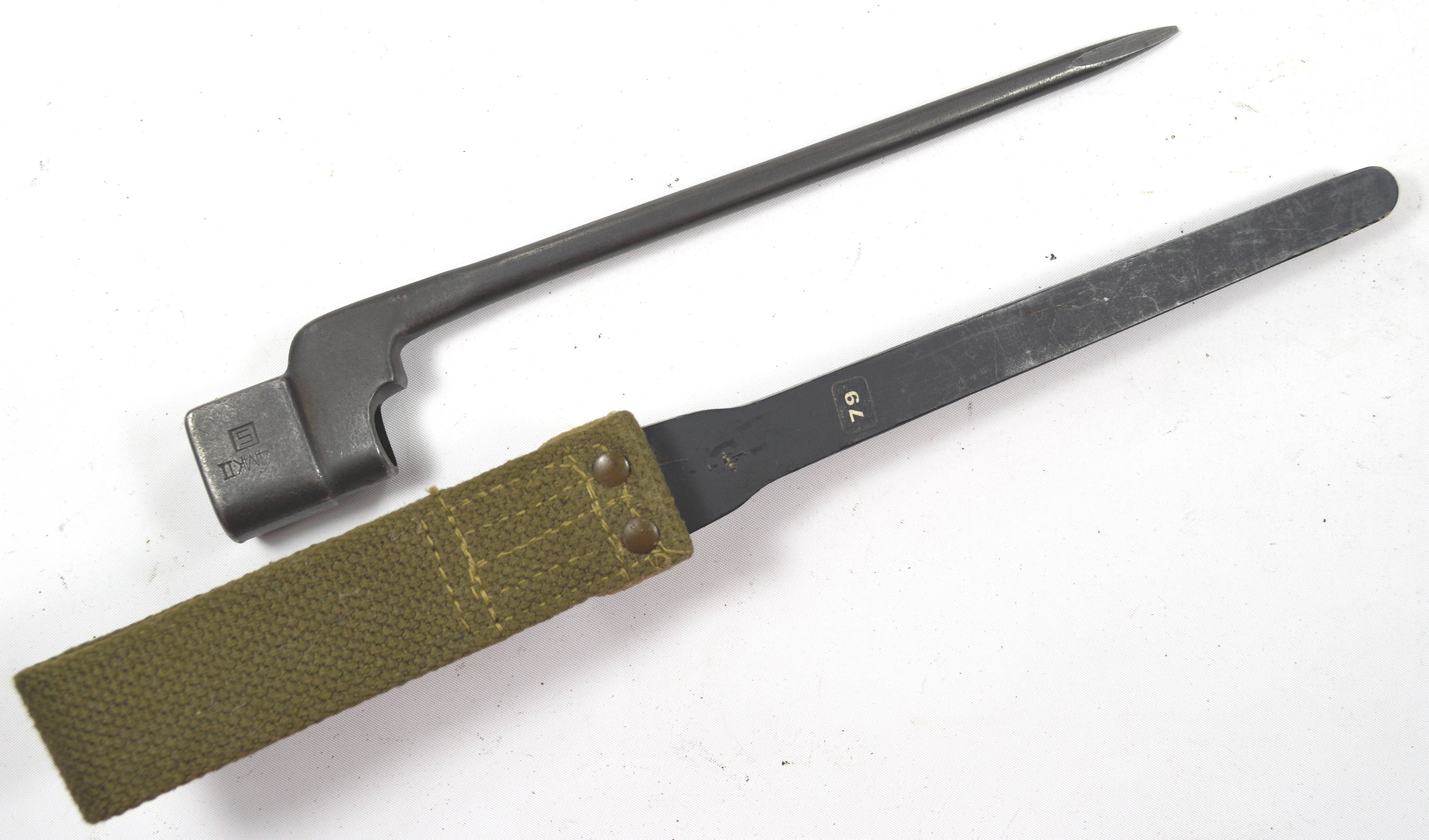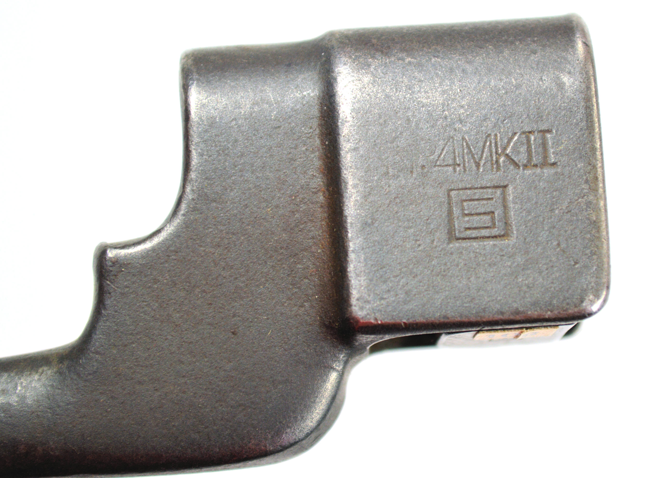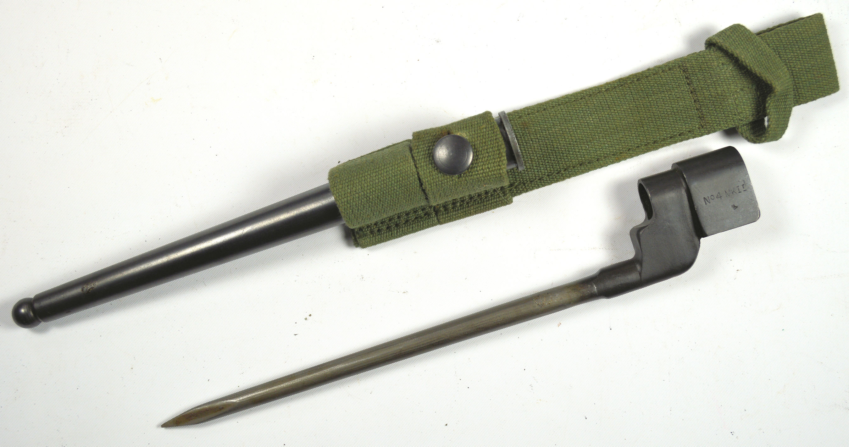 #108 - An American made Stevens No.4 Mk.II bayonet. A ‘Type 1’ made at Storms Forge, probably assembled at Pal Blade & Tool Co. and marked with a 6mm boxed ‘S’ trademark. A pre-13th March 1941 front to the socket. See ‘The Spirit of the Pike’ (Graham Priest) page 73 for reference. Complete with a Victory Plastics M5 scabbard and riveted frog. See ‘The Spirit of the Pike’ page 148.#411 - A New Zealand issued, Longbranch made No.4 Mk.II. Blade etched with Canadian government ownership mark – C/arrow. Socket stamped with Longbranch logo, and engraved with NZ ownership and rifle number 30629. The exact bayonet illustrated in ‘The Spirit of the Pike’ (Graham Priest) page 313. Complete with Mk.I scabbard and P1937 WE frog.
