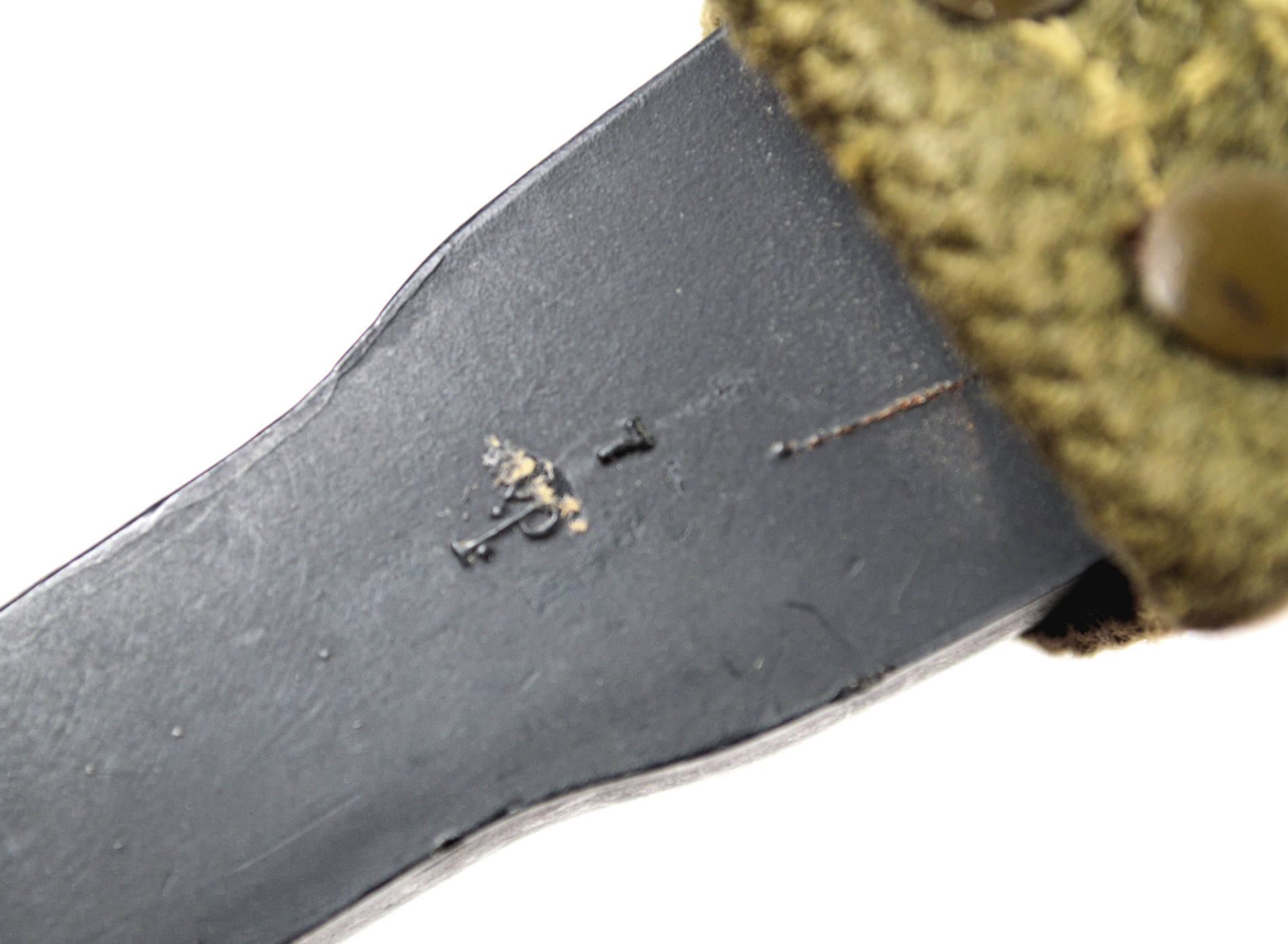 The Mk.I scabbard with body stamped C/arrow, and %, one of 10 percent sampled prior to issue in the Canadian Army.