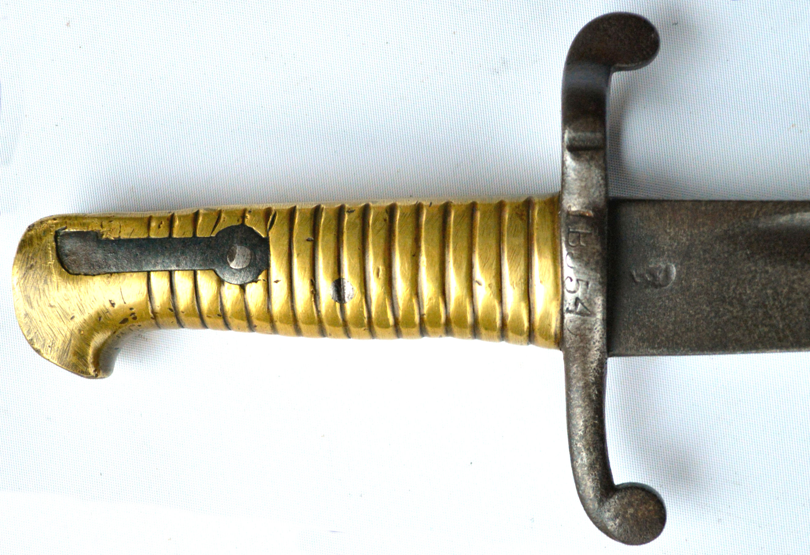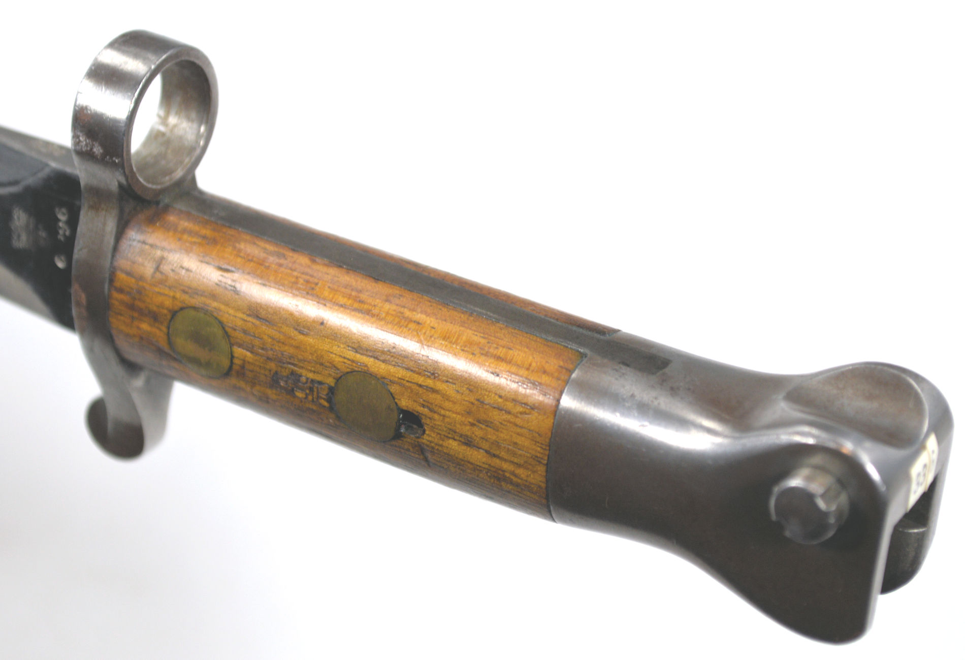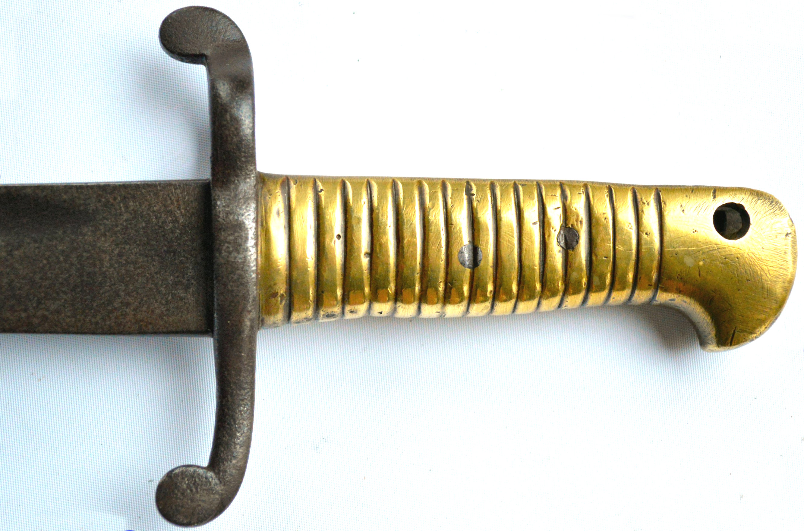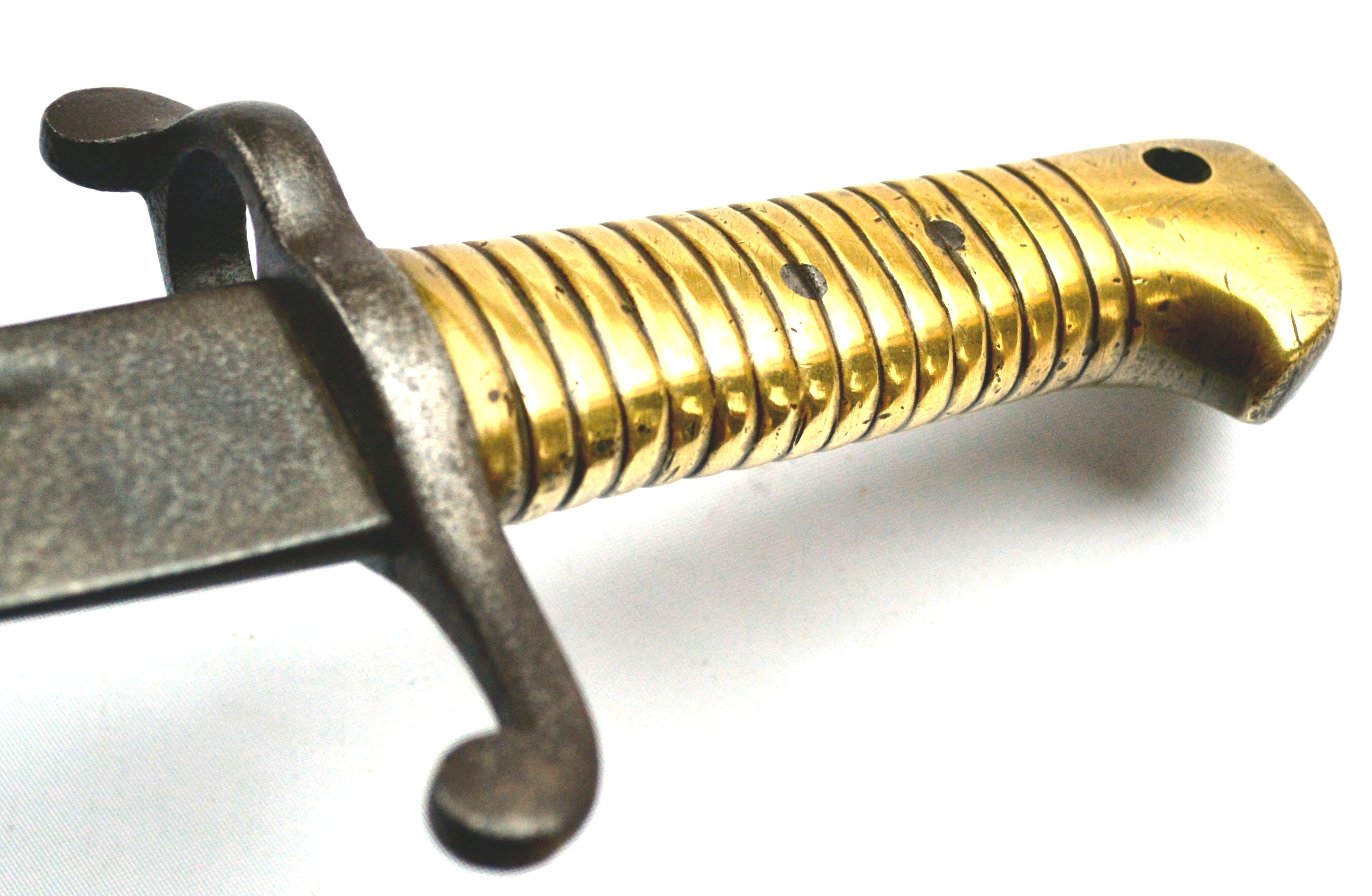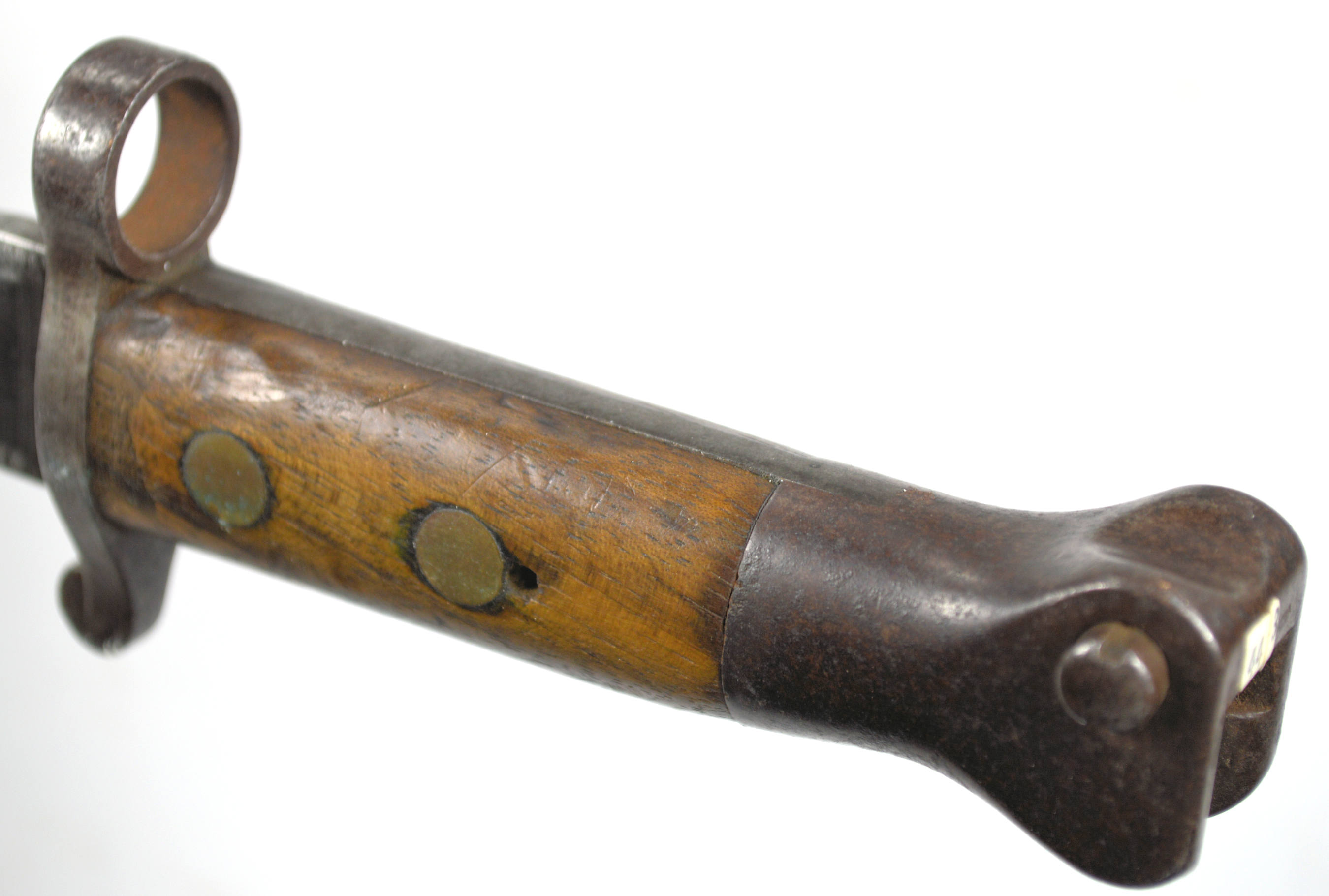 - A yataghan sword bayonet with a lug and short bat hilt fitting, heavily modified. The crossguard quillons have been removed,