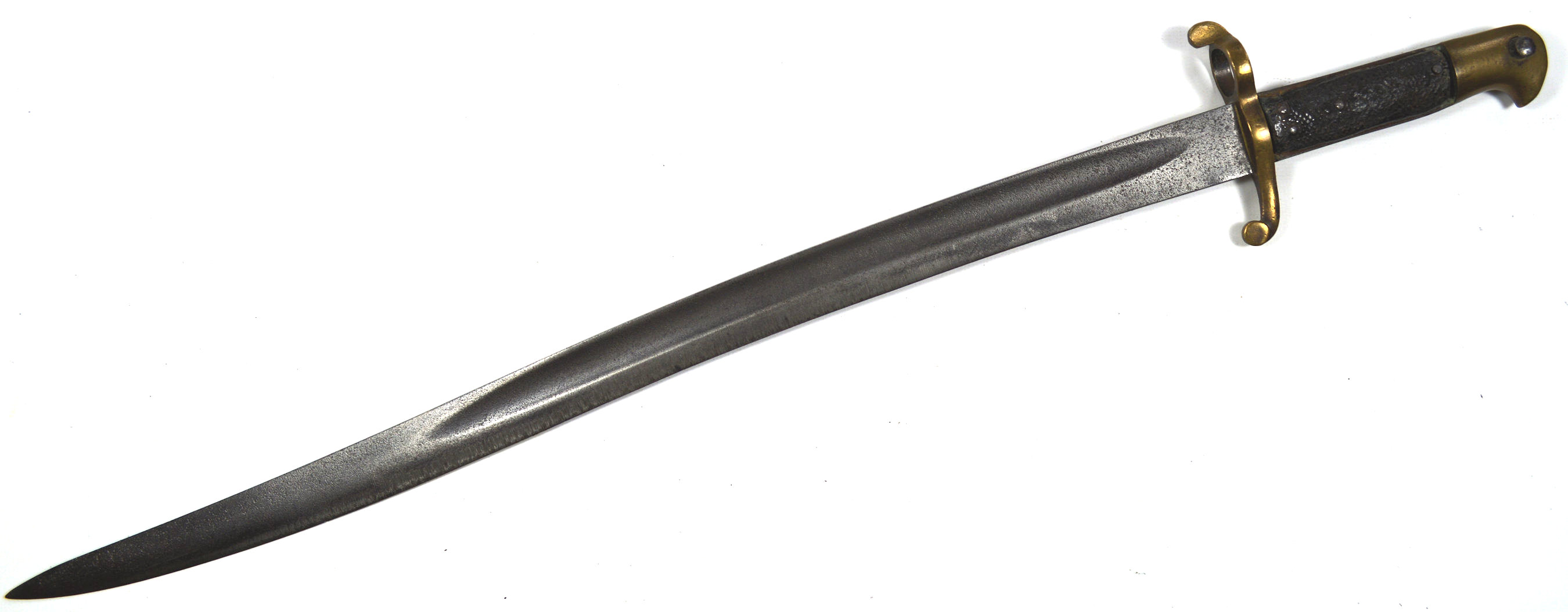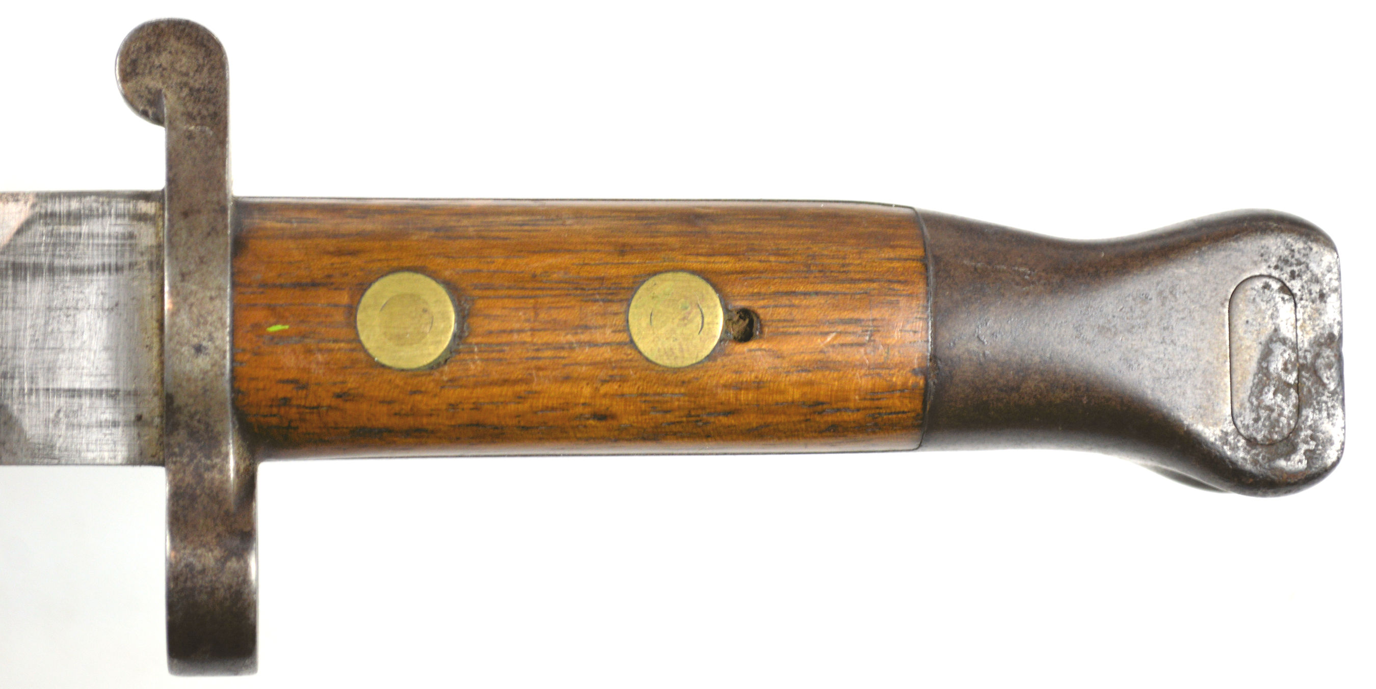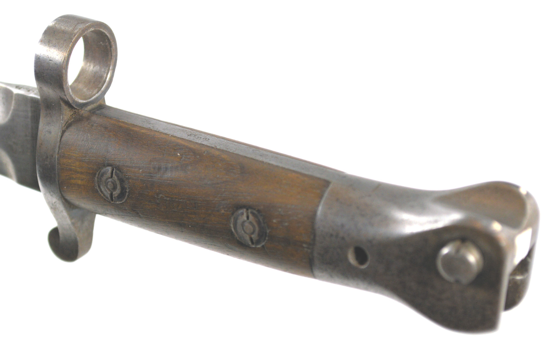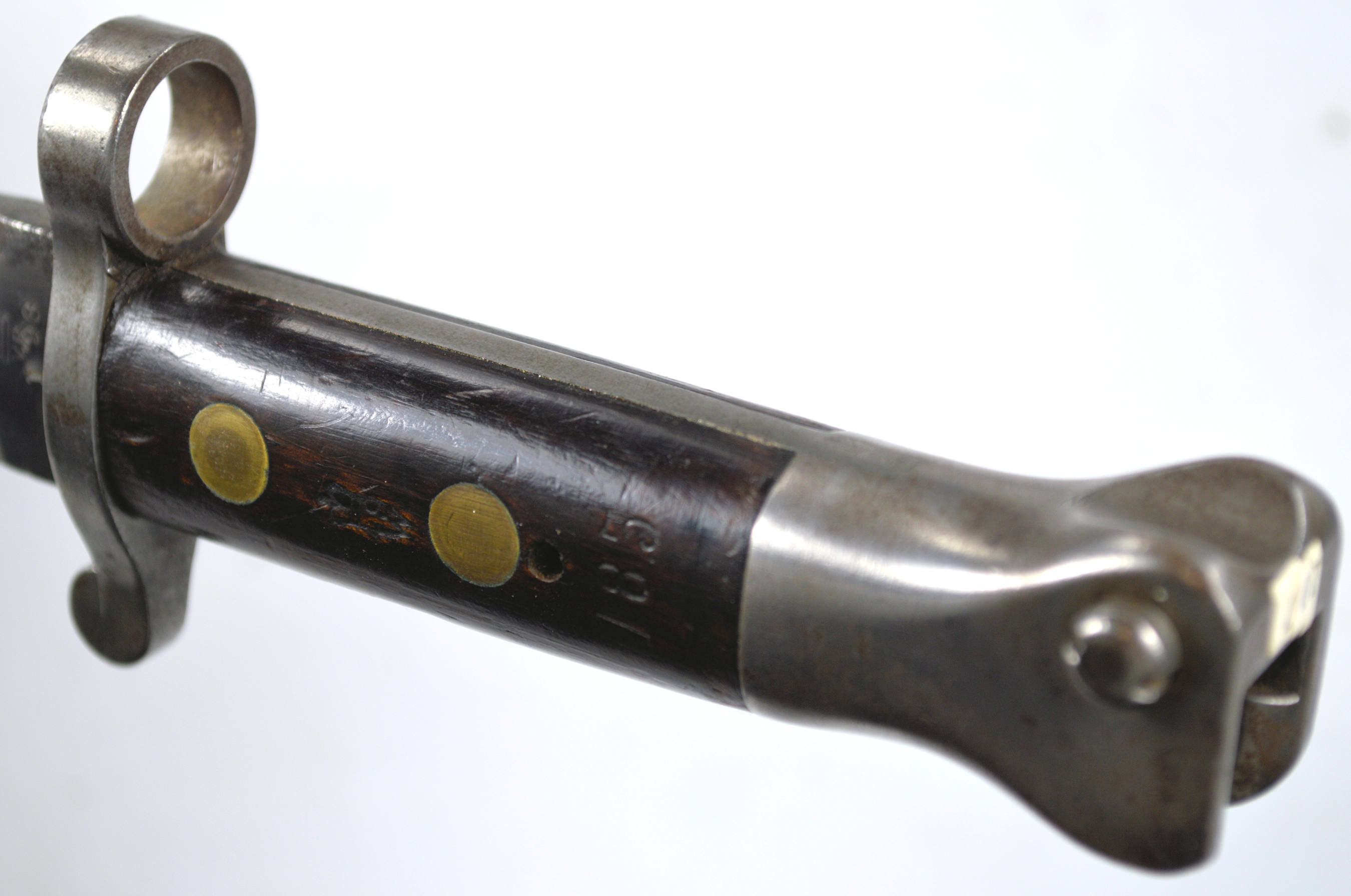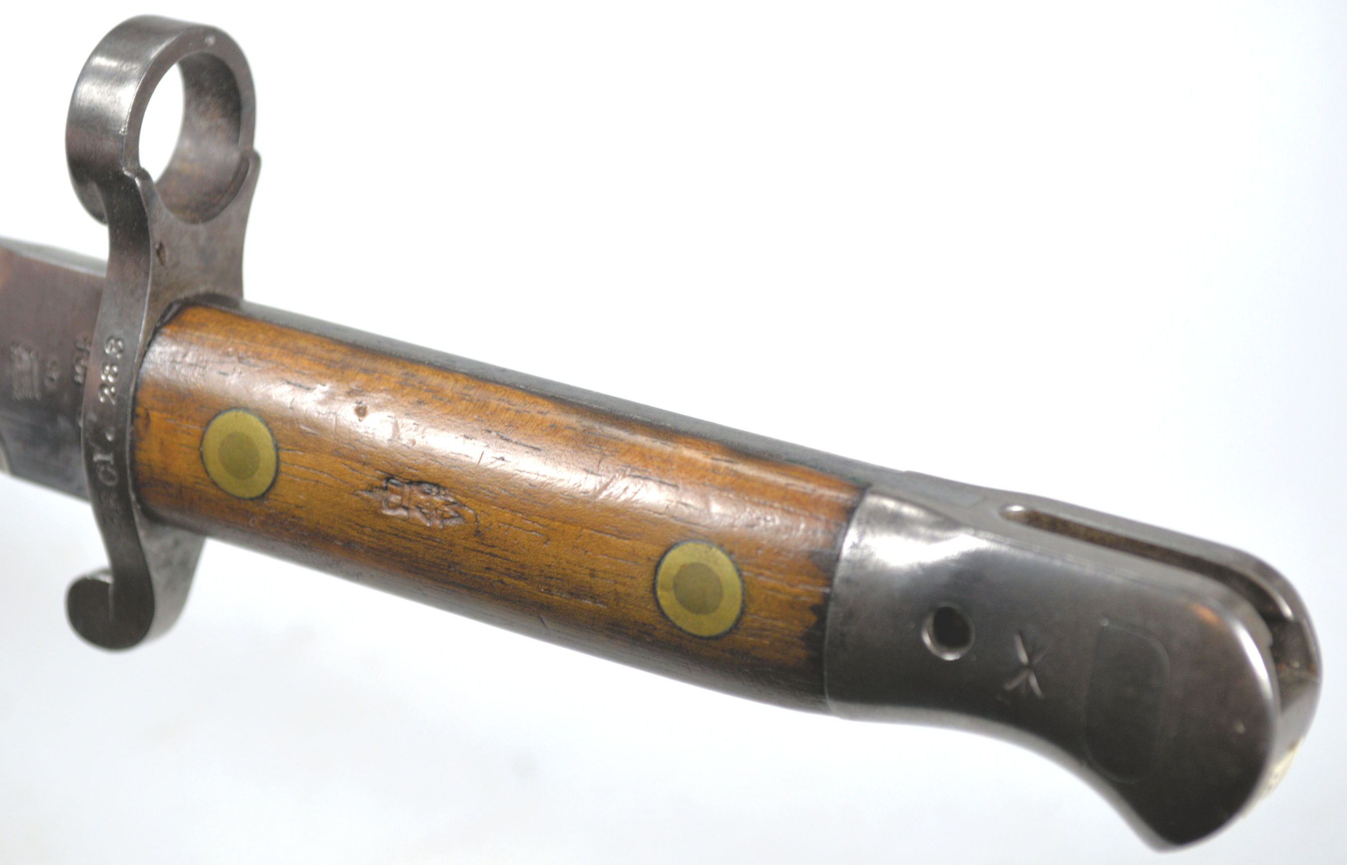 - A yataghan sword bayonet with a lug and short bat hilt fitting, heavily modified. The crossguard quillons have been removed,