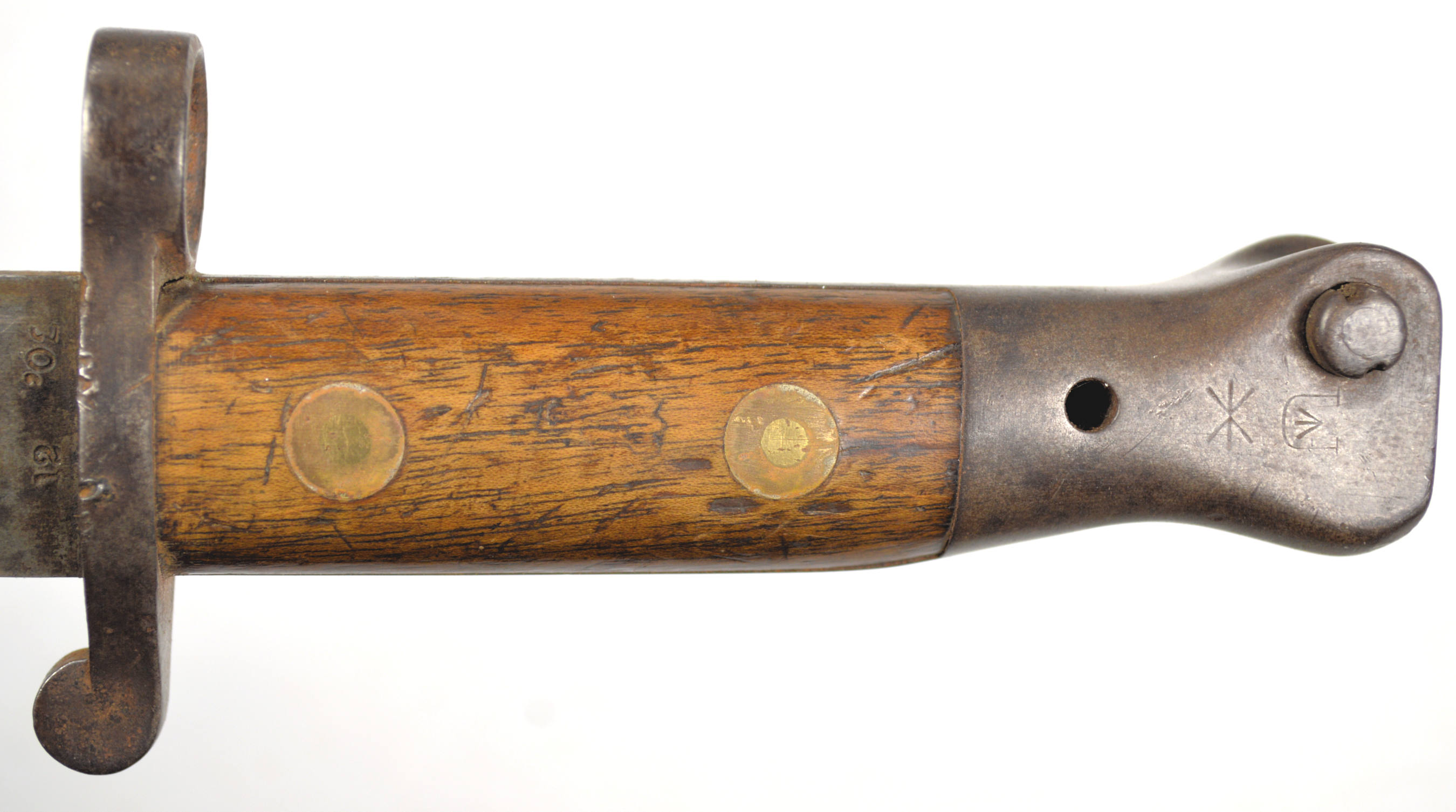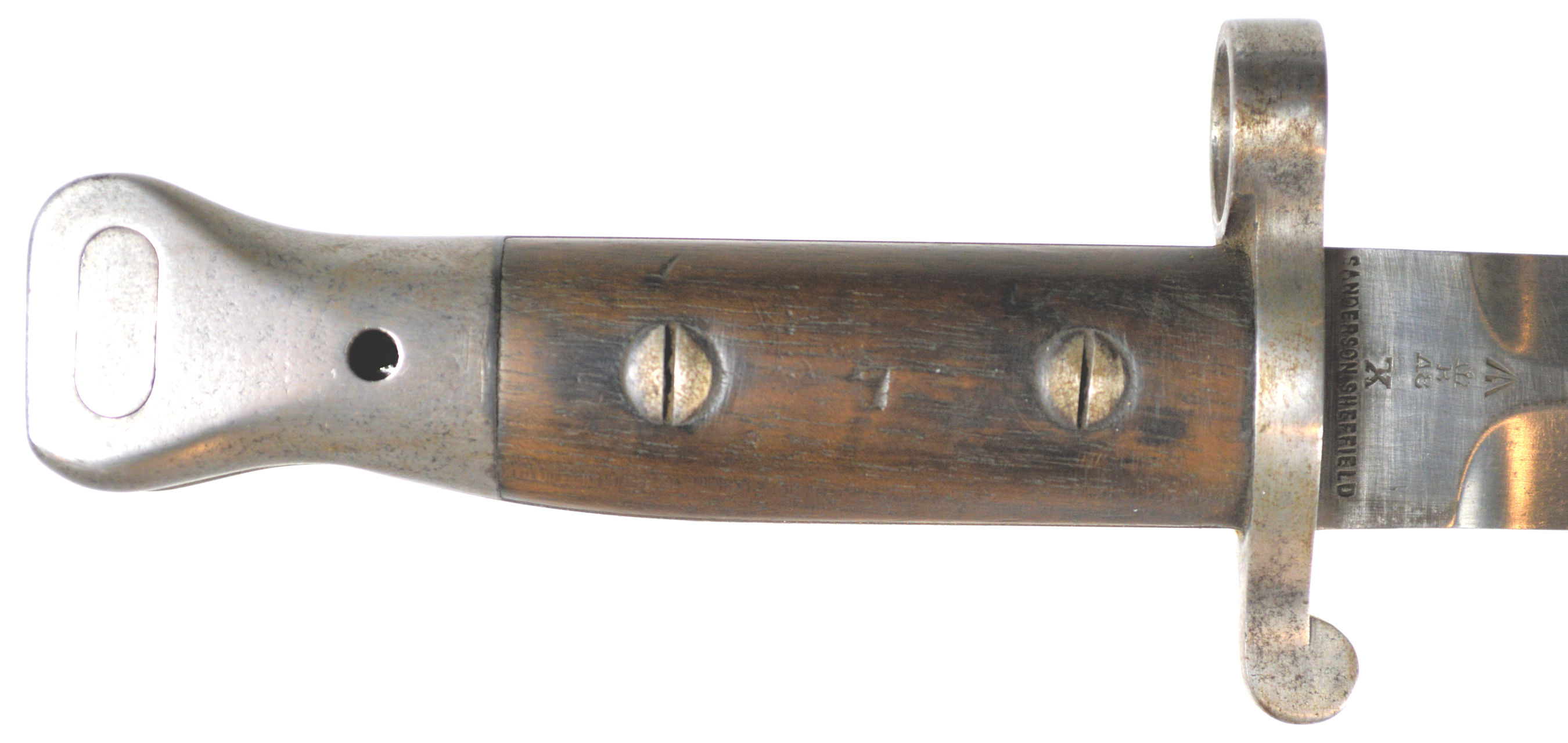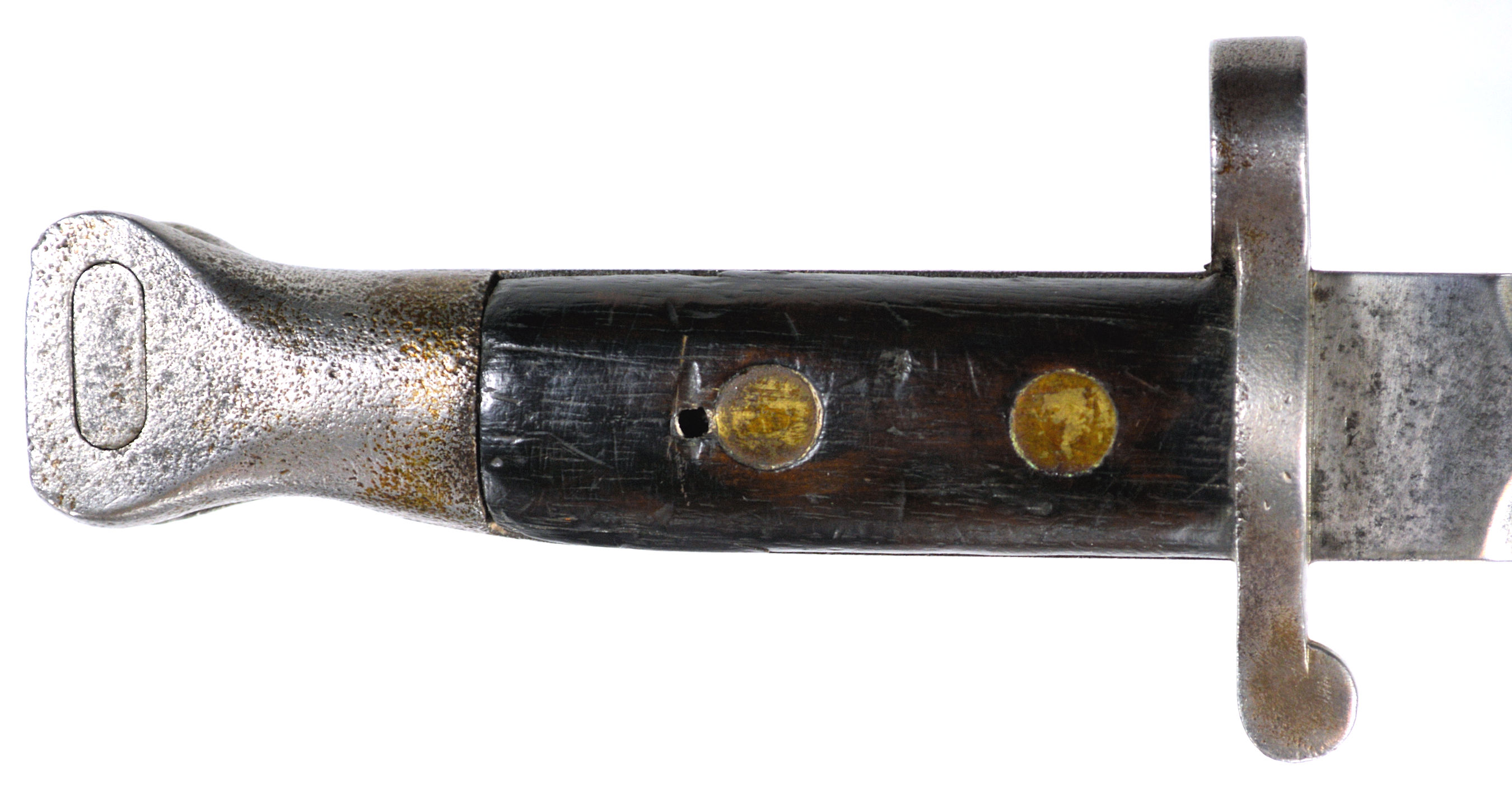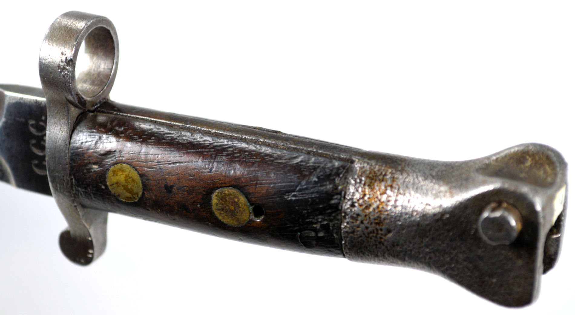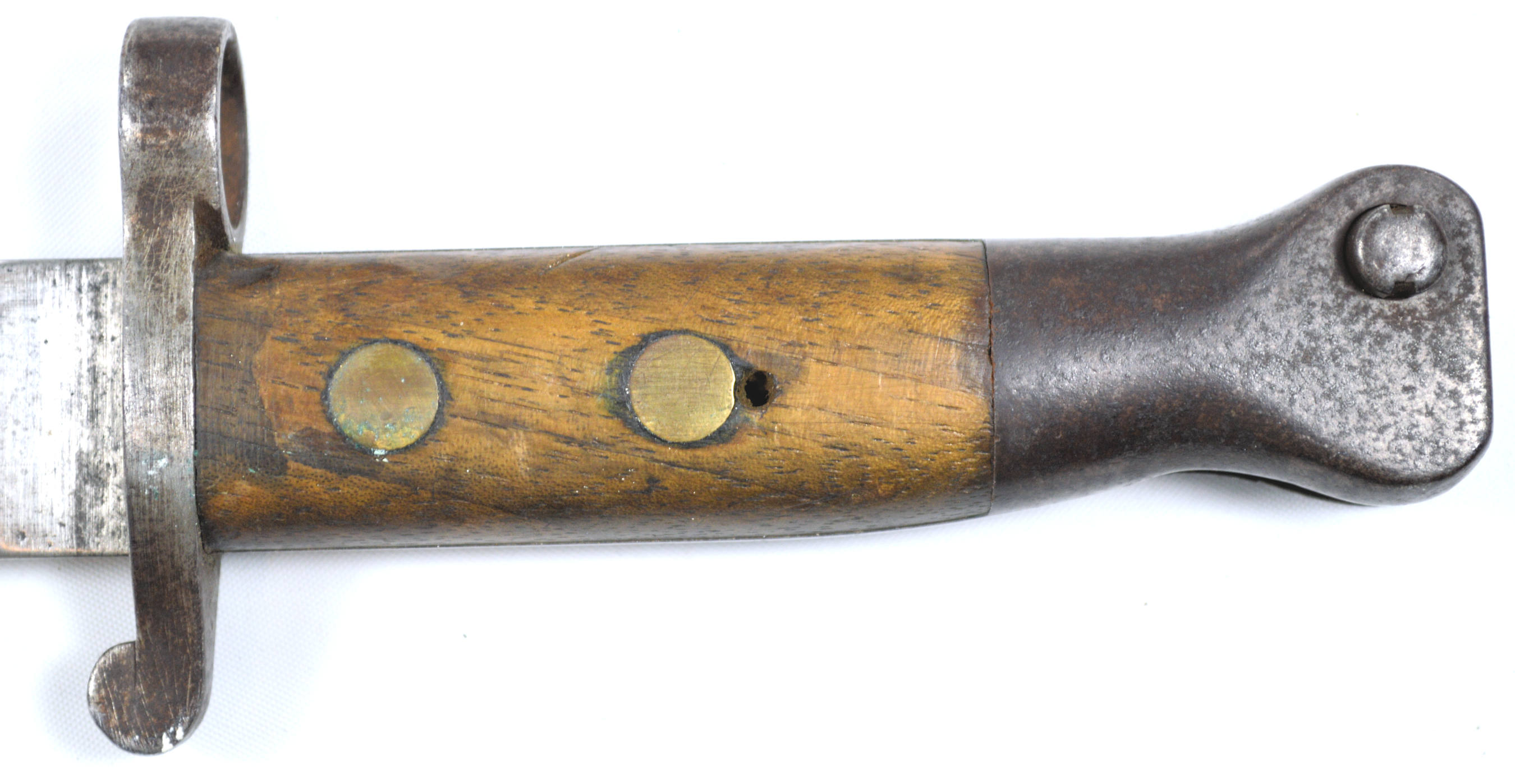 - A yataghan sword bayonet with a lug and short bat hilt fitting, heavily modified. The crossguard quillons have been removed,