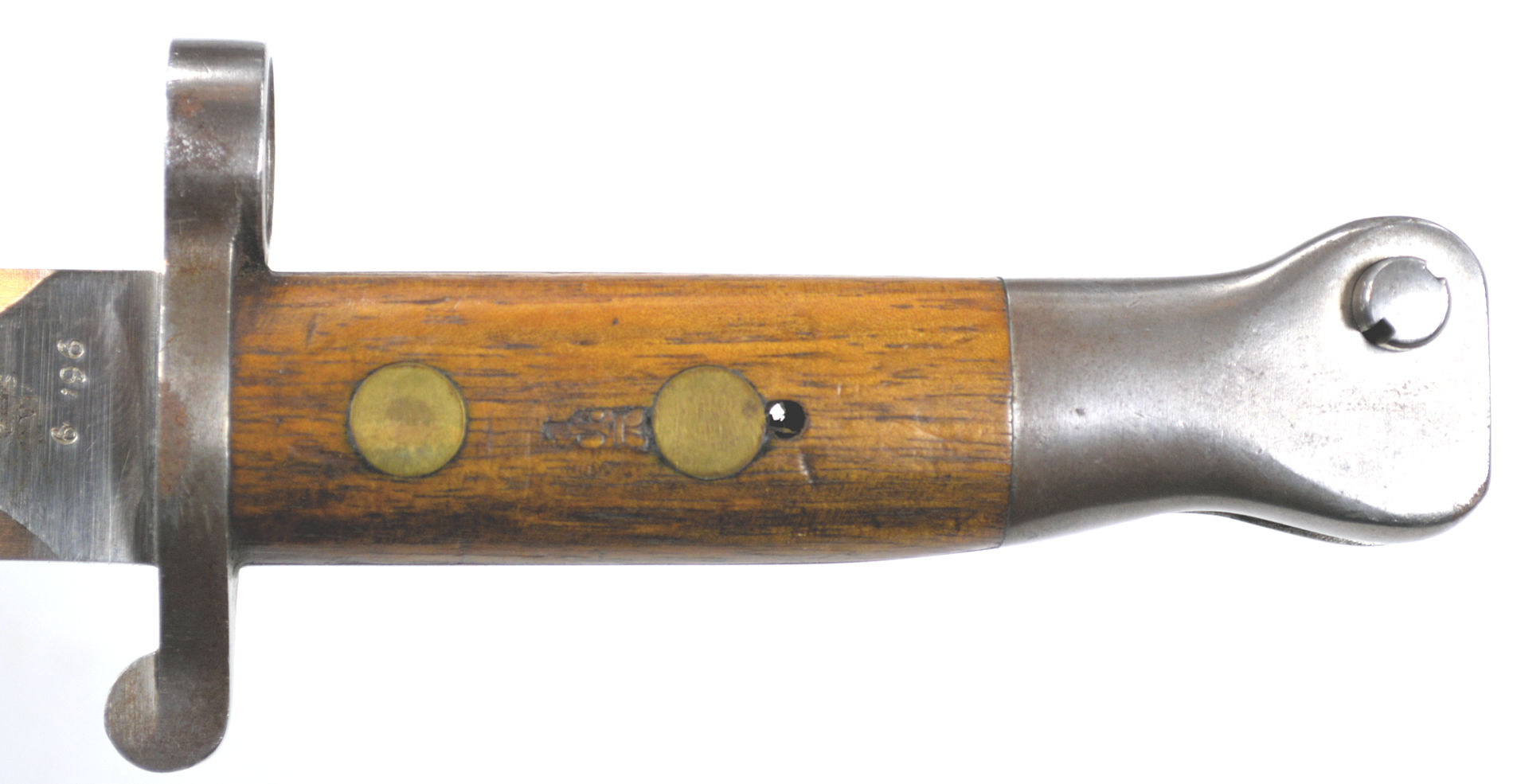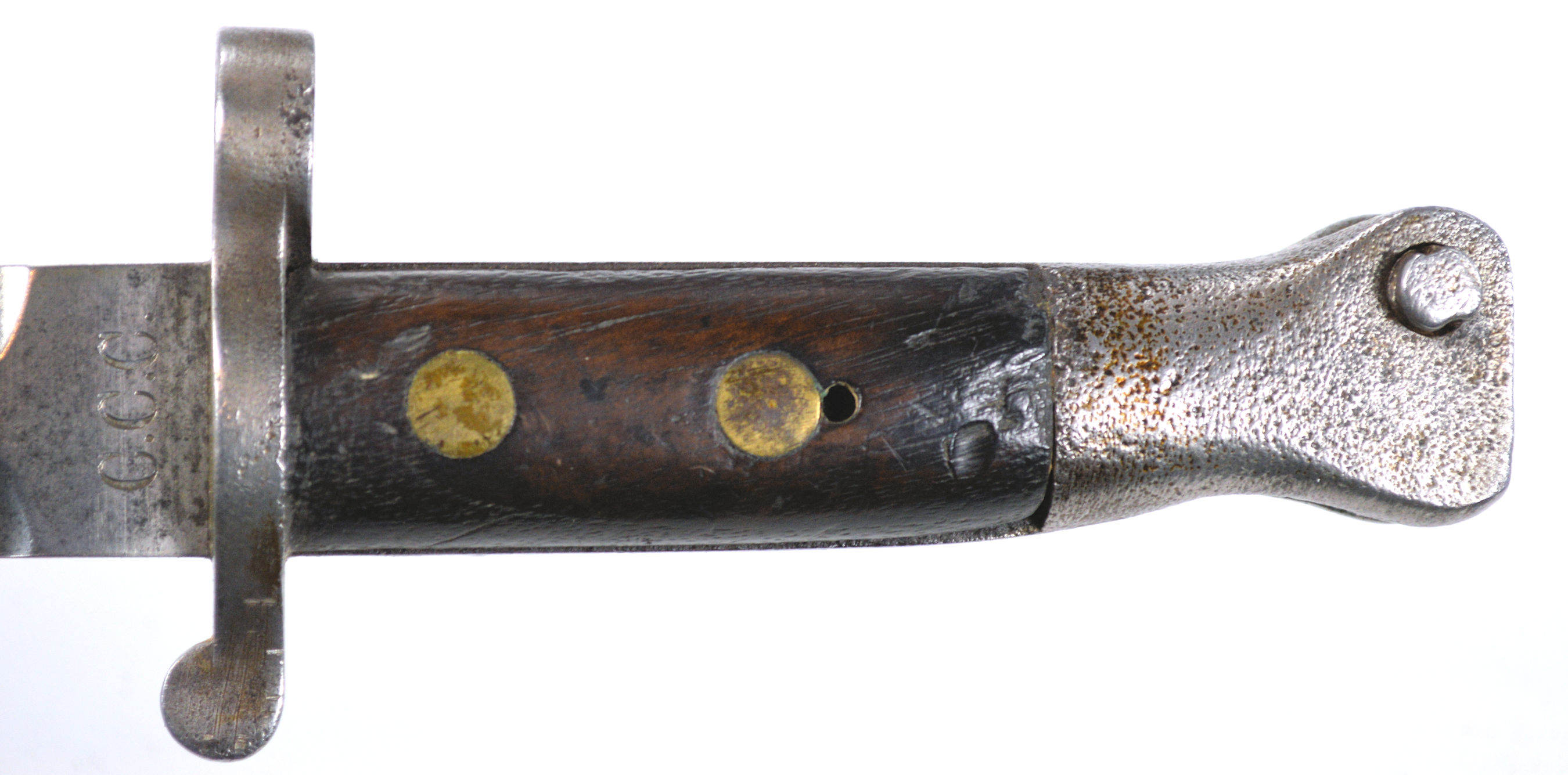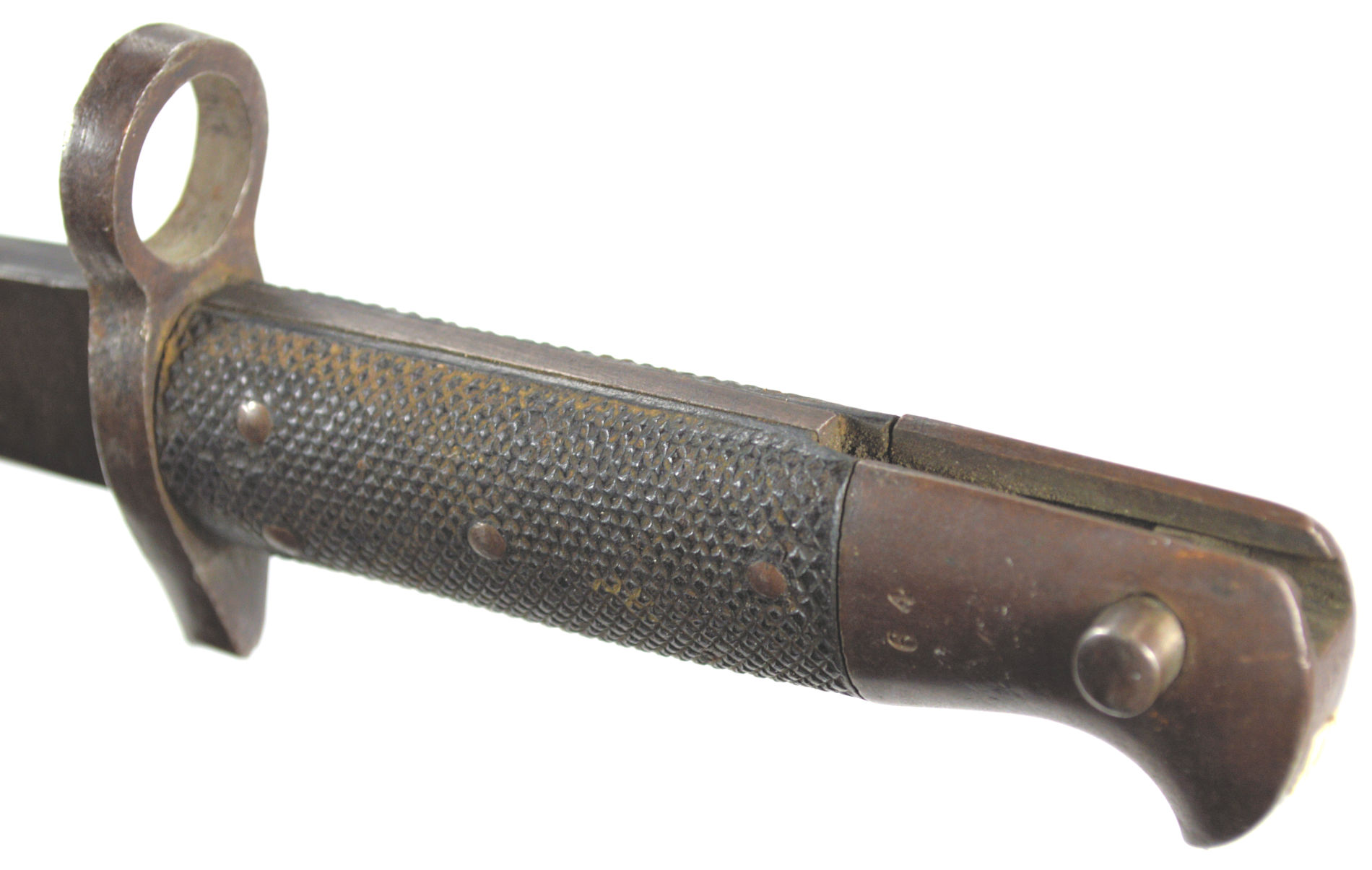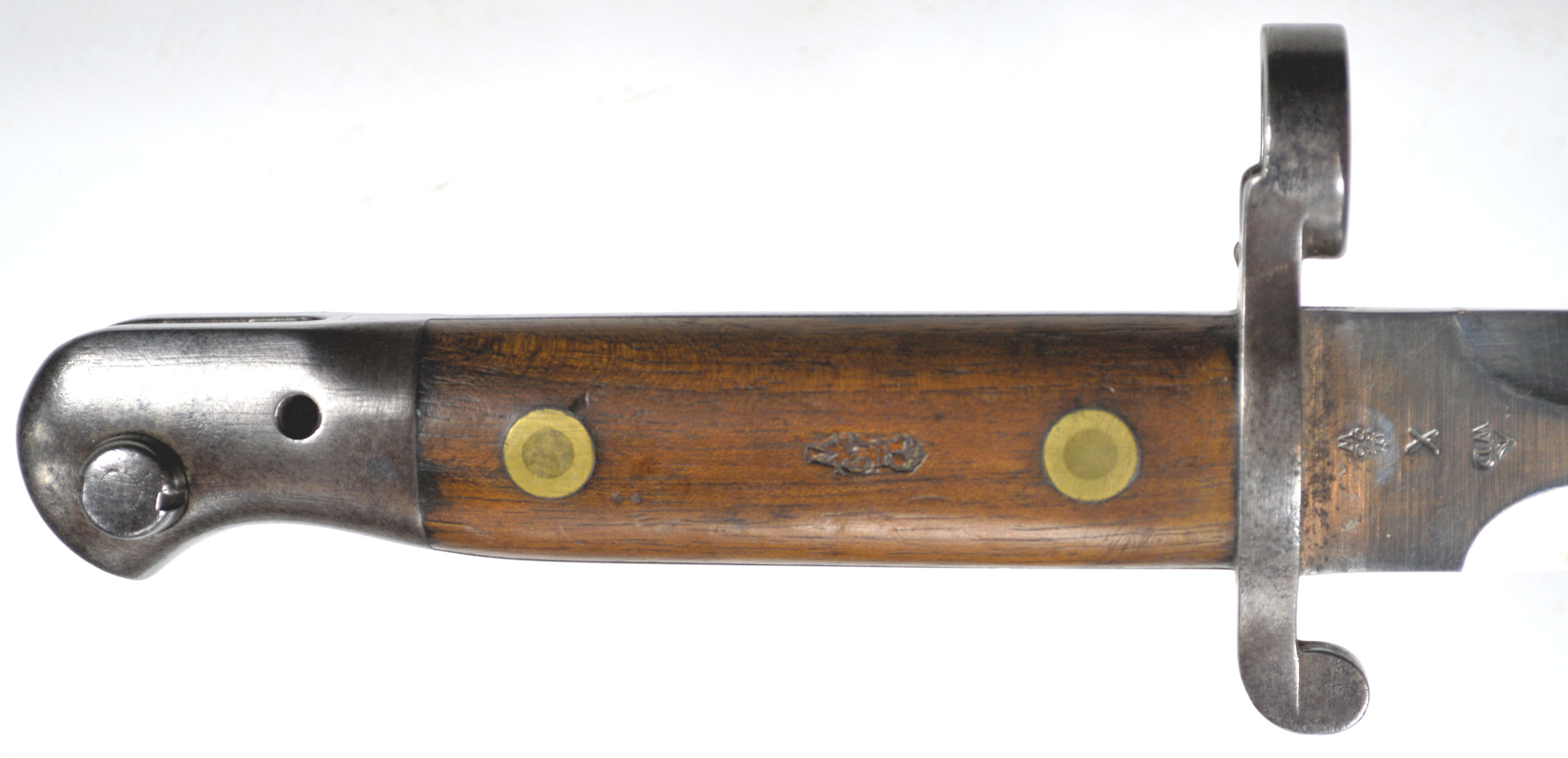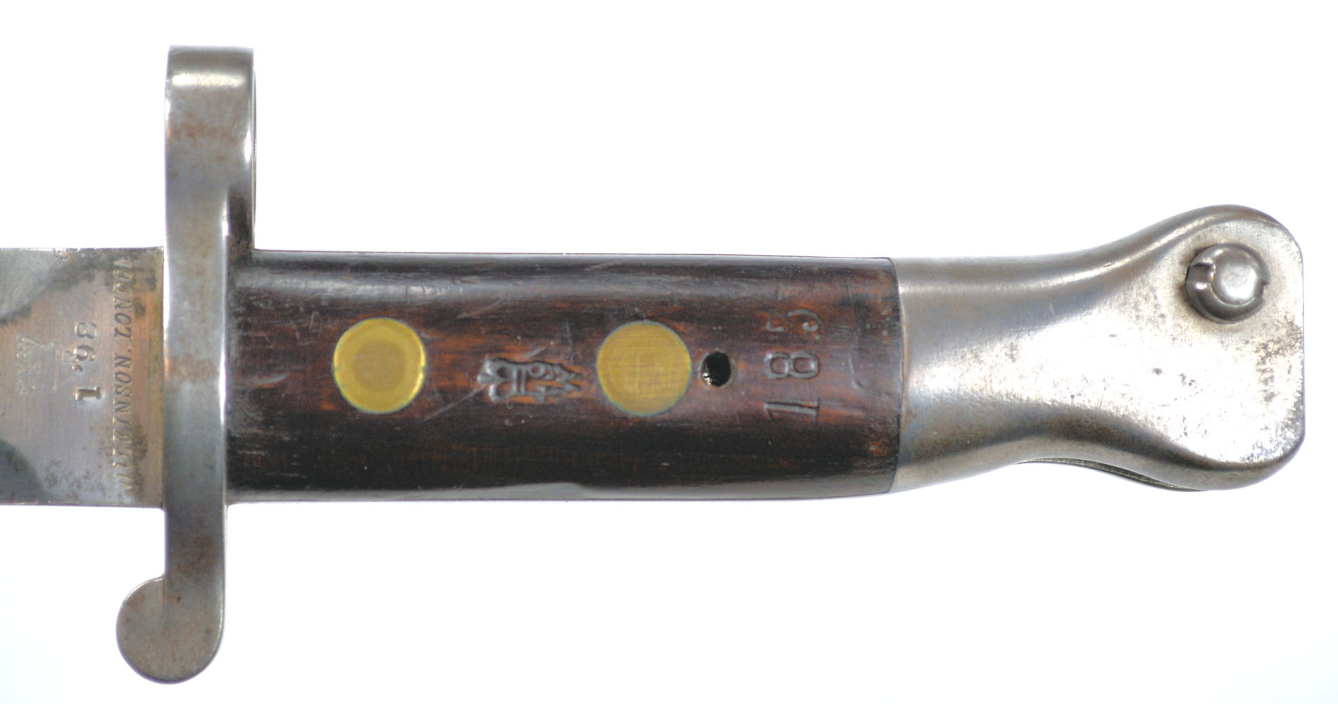 - A yataghan sword bayonet with a lug and short bat hilt fitting, heavily modified. The crossguard quillons have been removed,