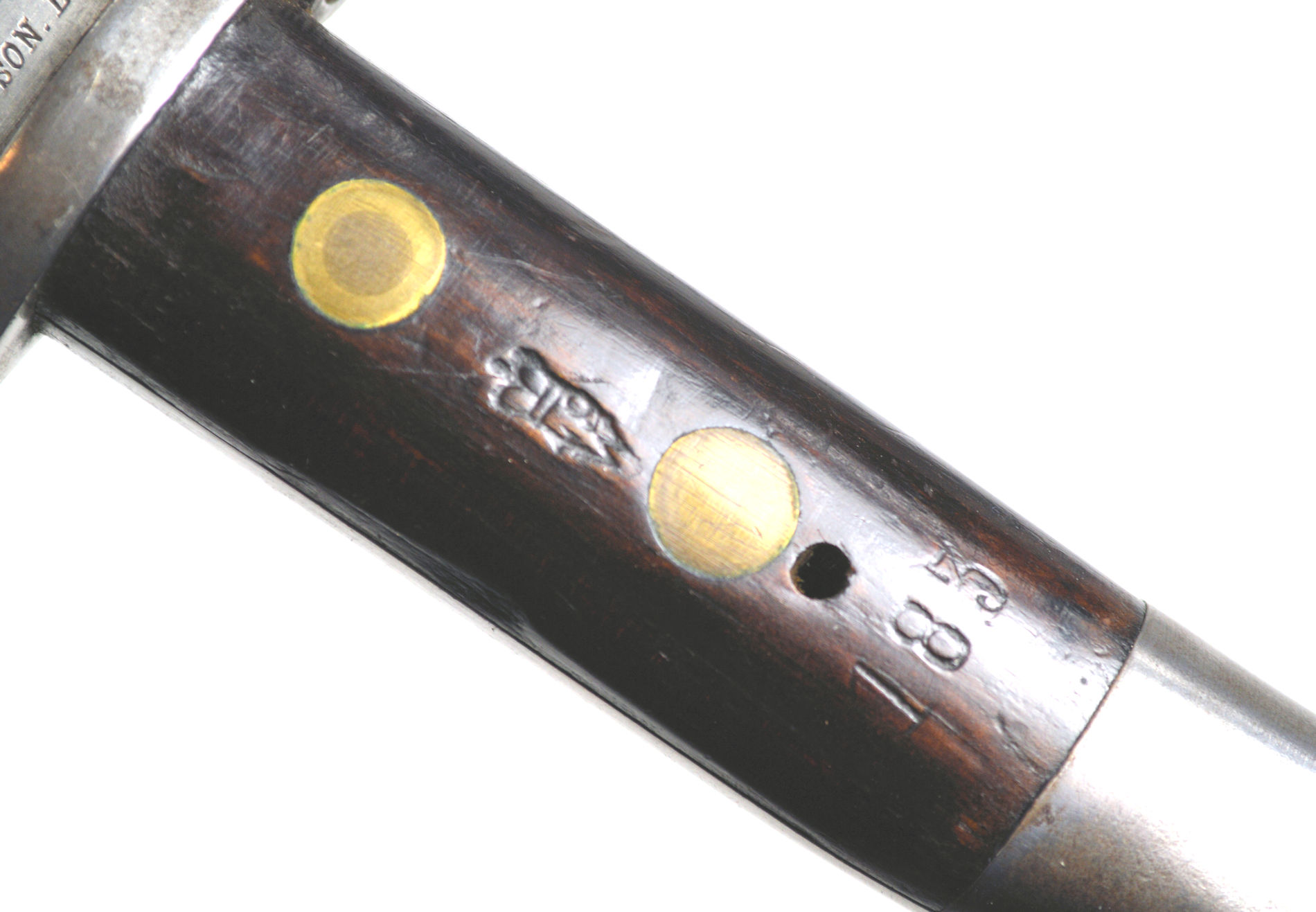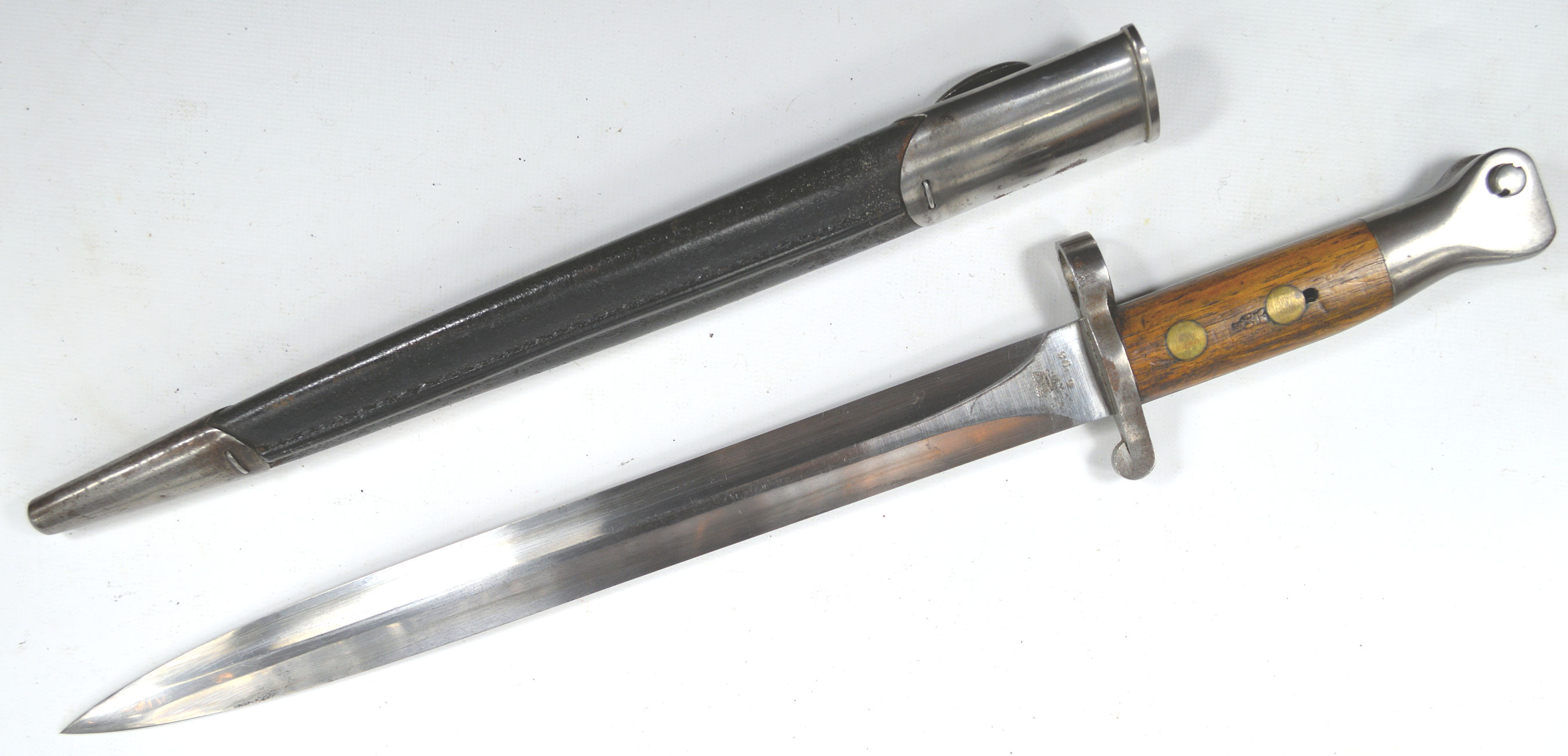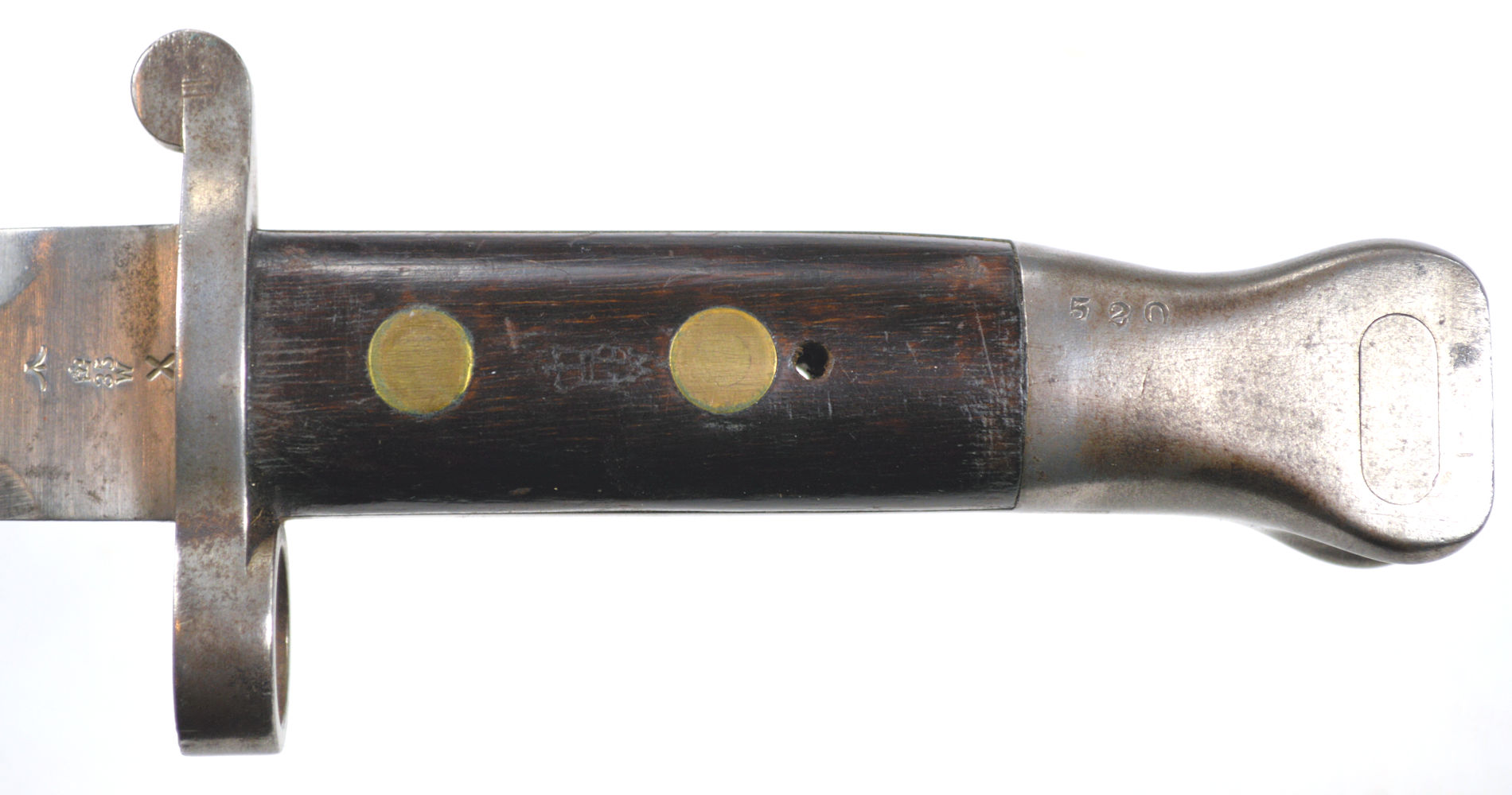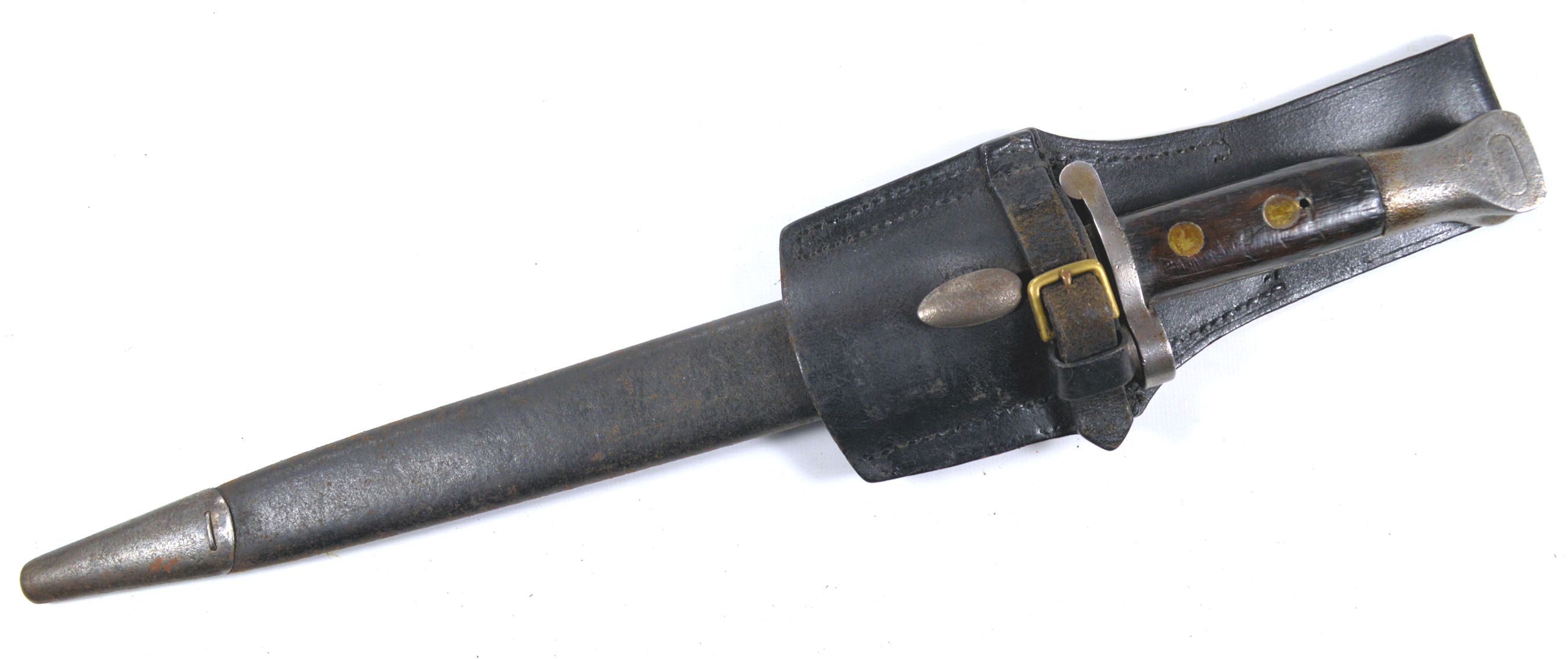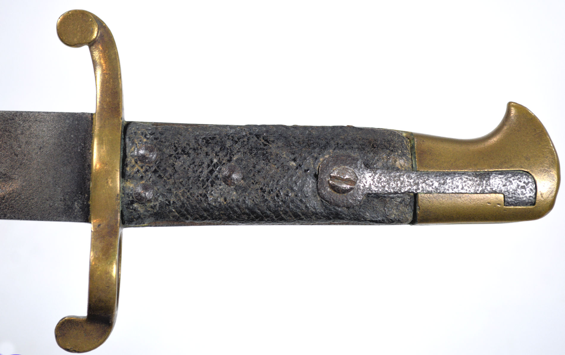 - A yataghan sword bayonet with a lug and short bat hilt fitting, heavily modified. The crossguard quillons have been removed,