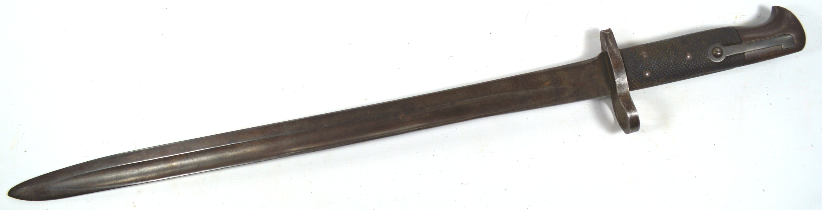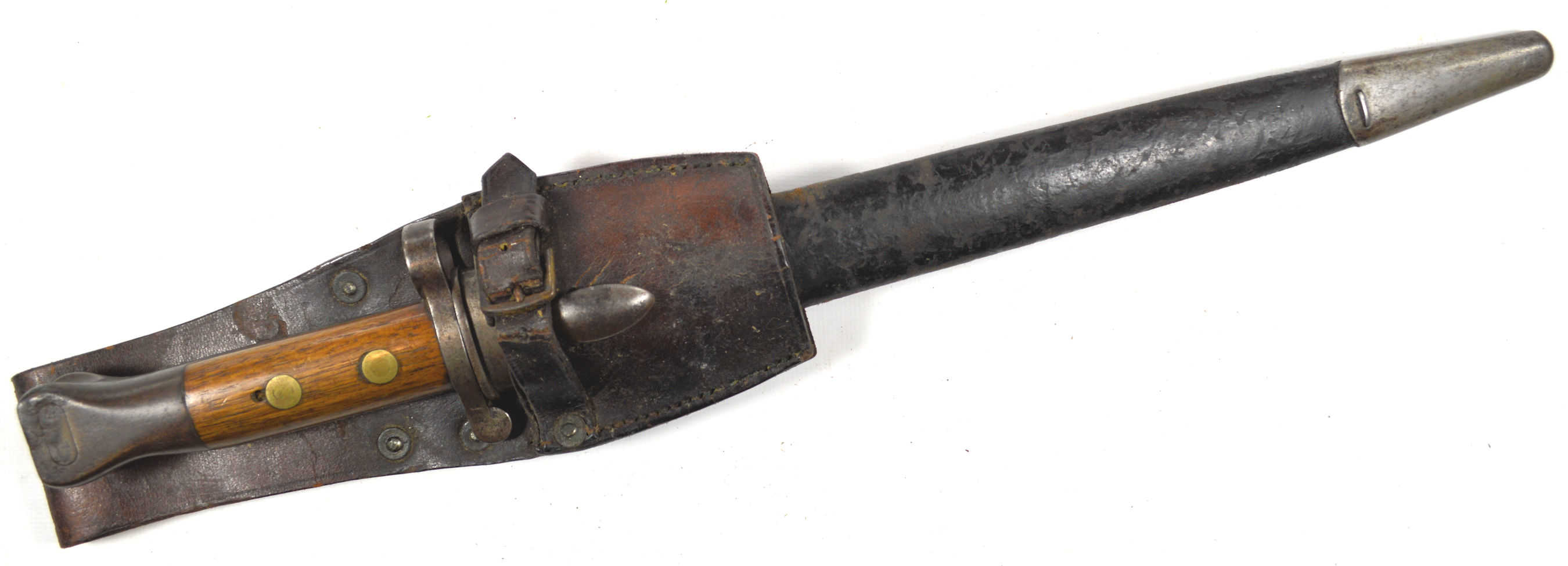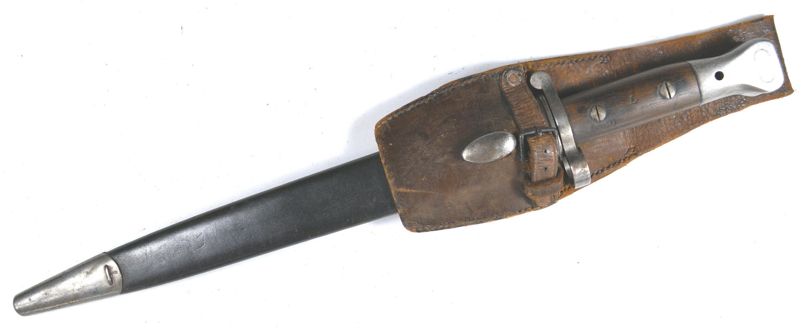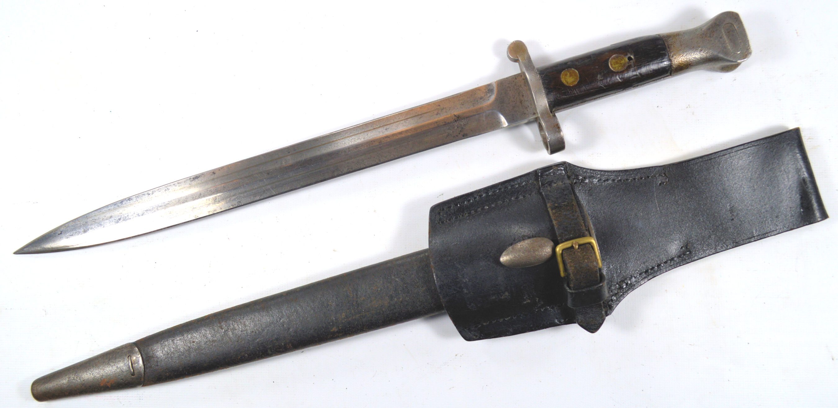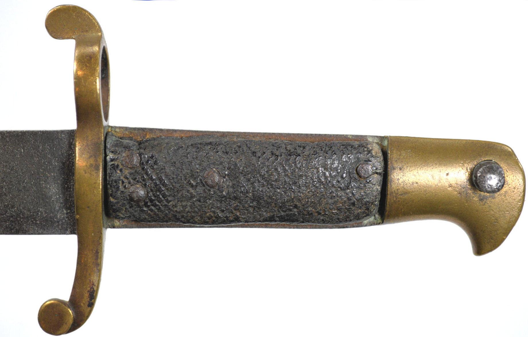 - A yataghan sword bayonet with a lug and short bat hilt fitting, heavily modified. The crossguard quillons have been removed,