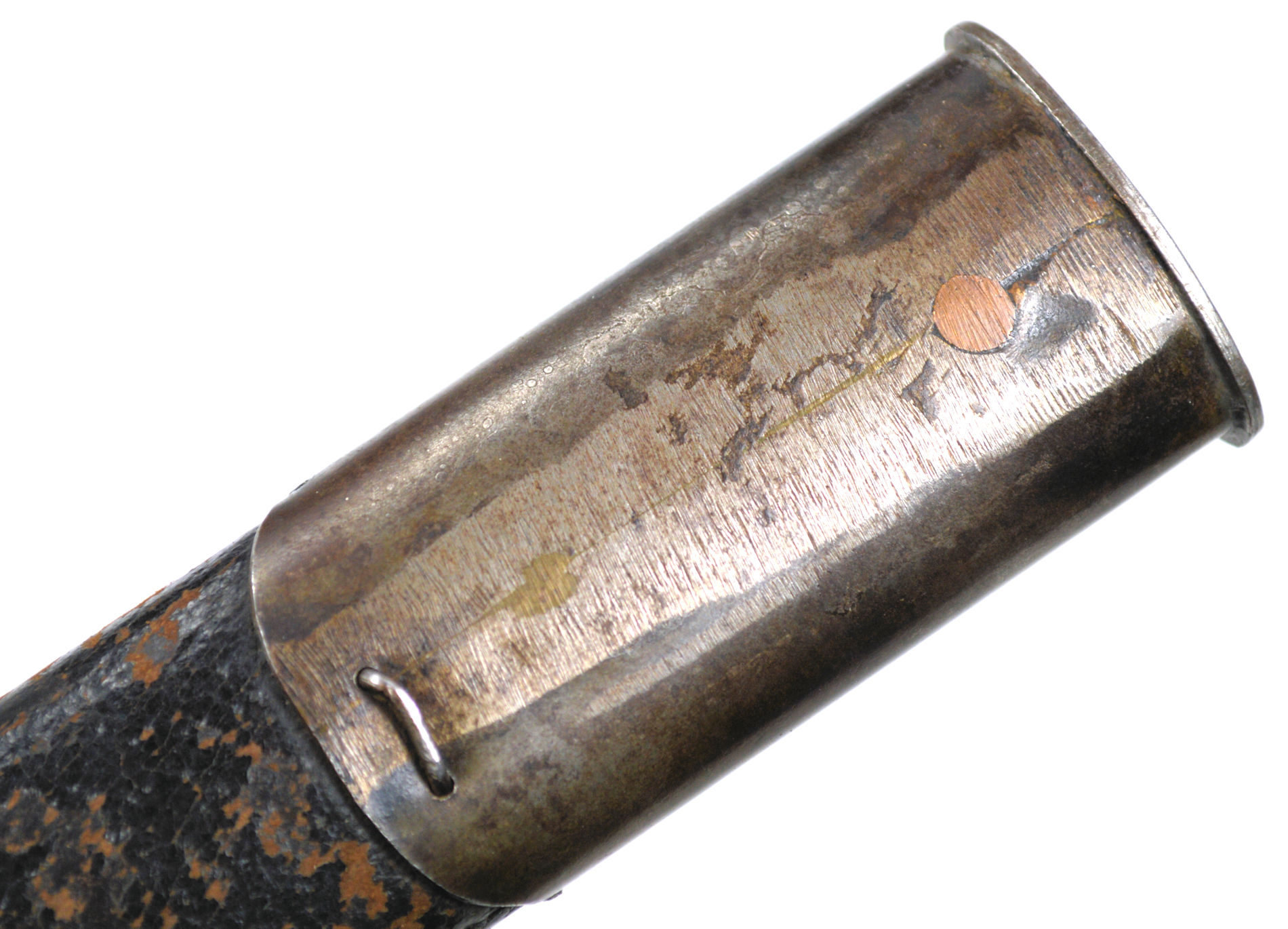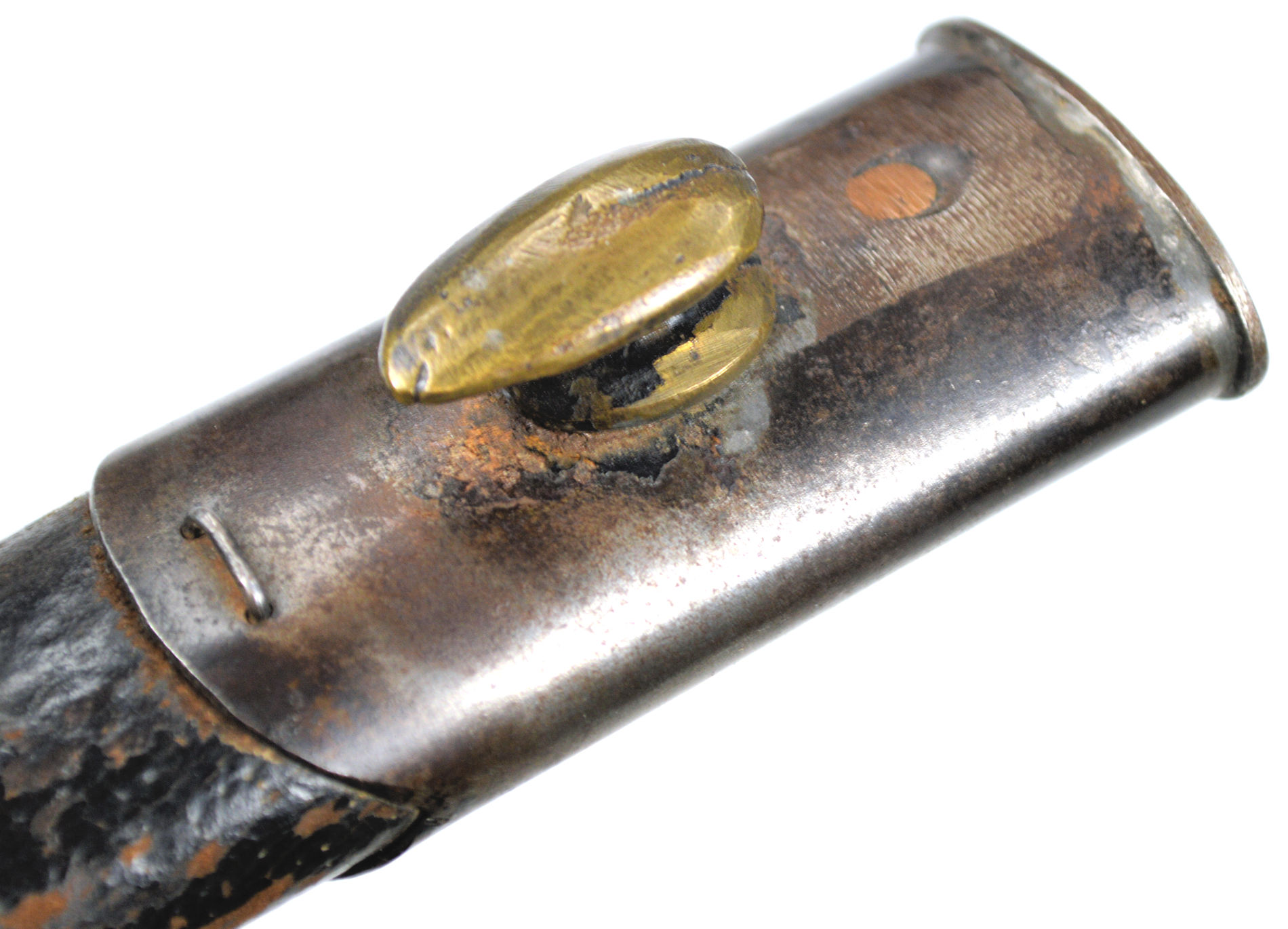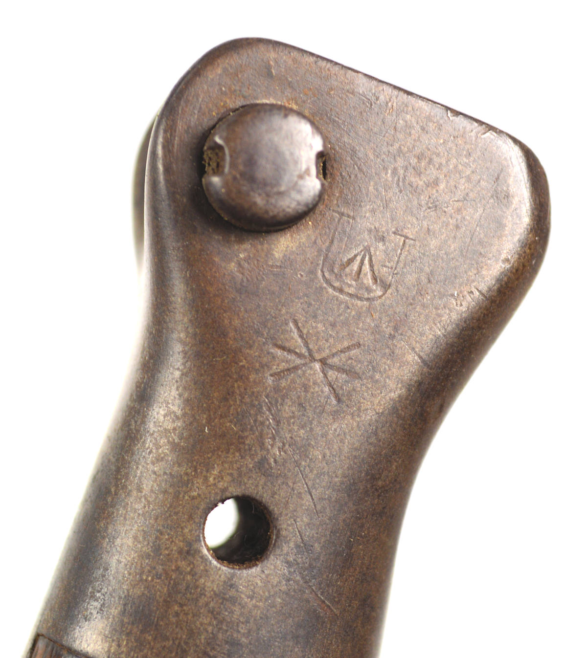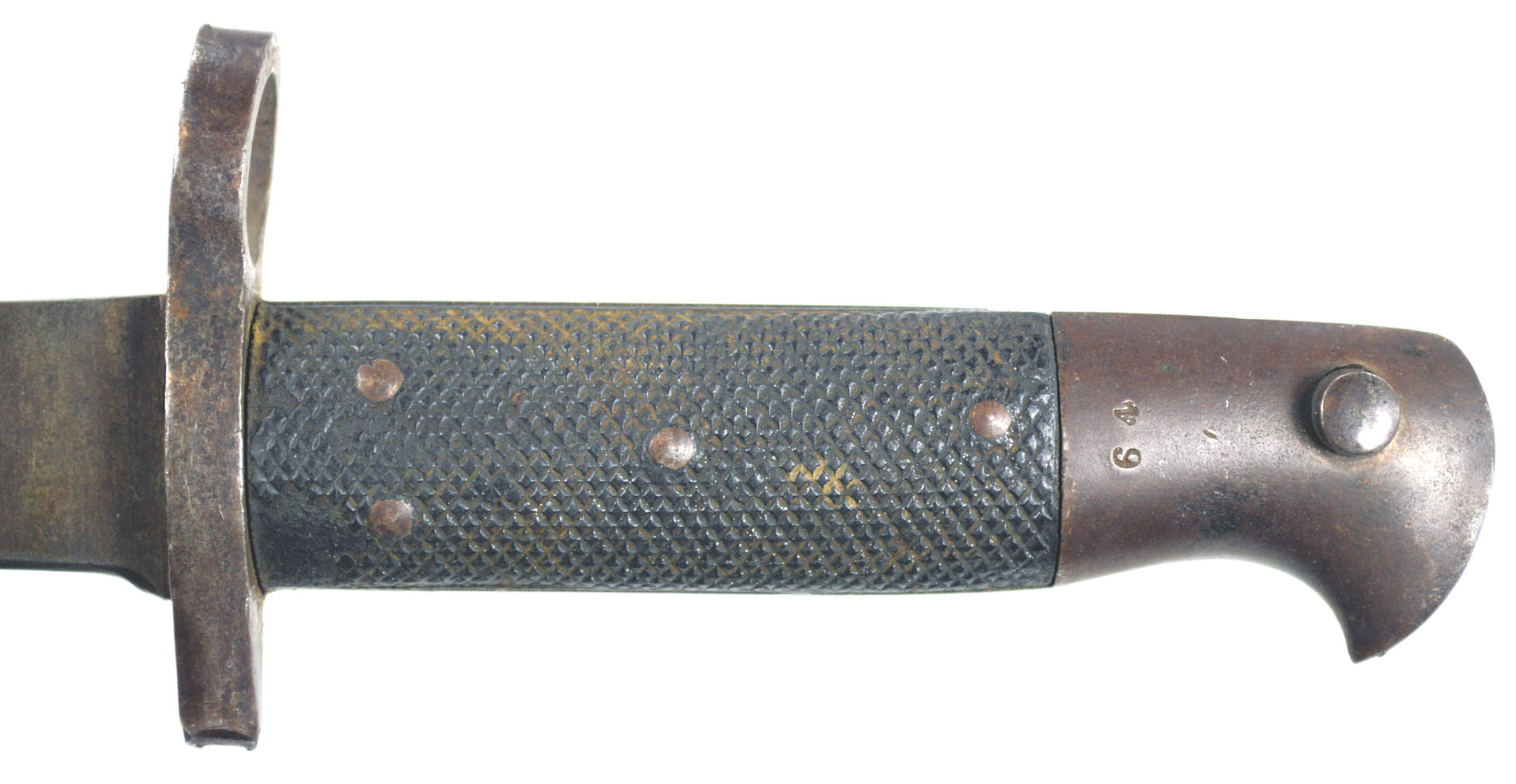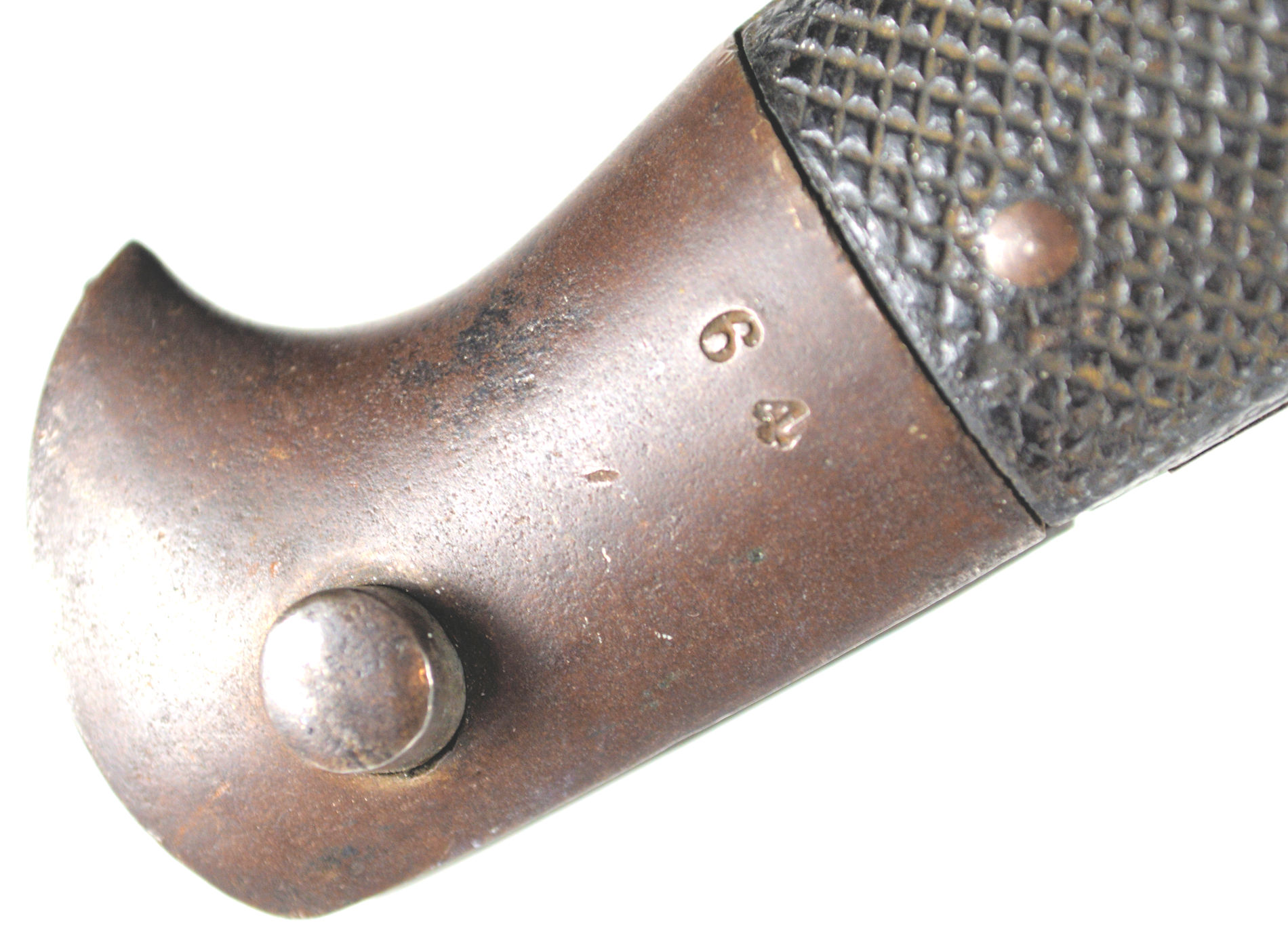 - A yataghan sword bayonet with a lug and short bat hilt fitting, heavily modified. The crossguard quillons have been removed,