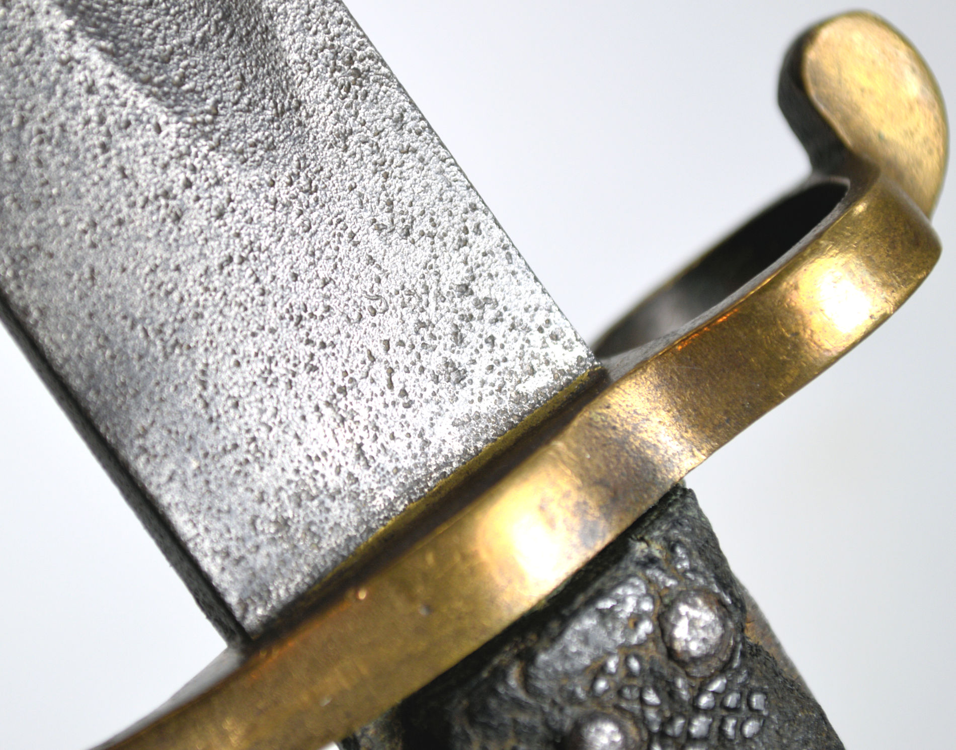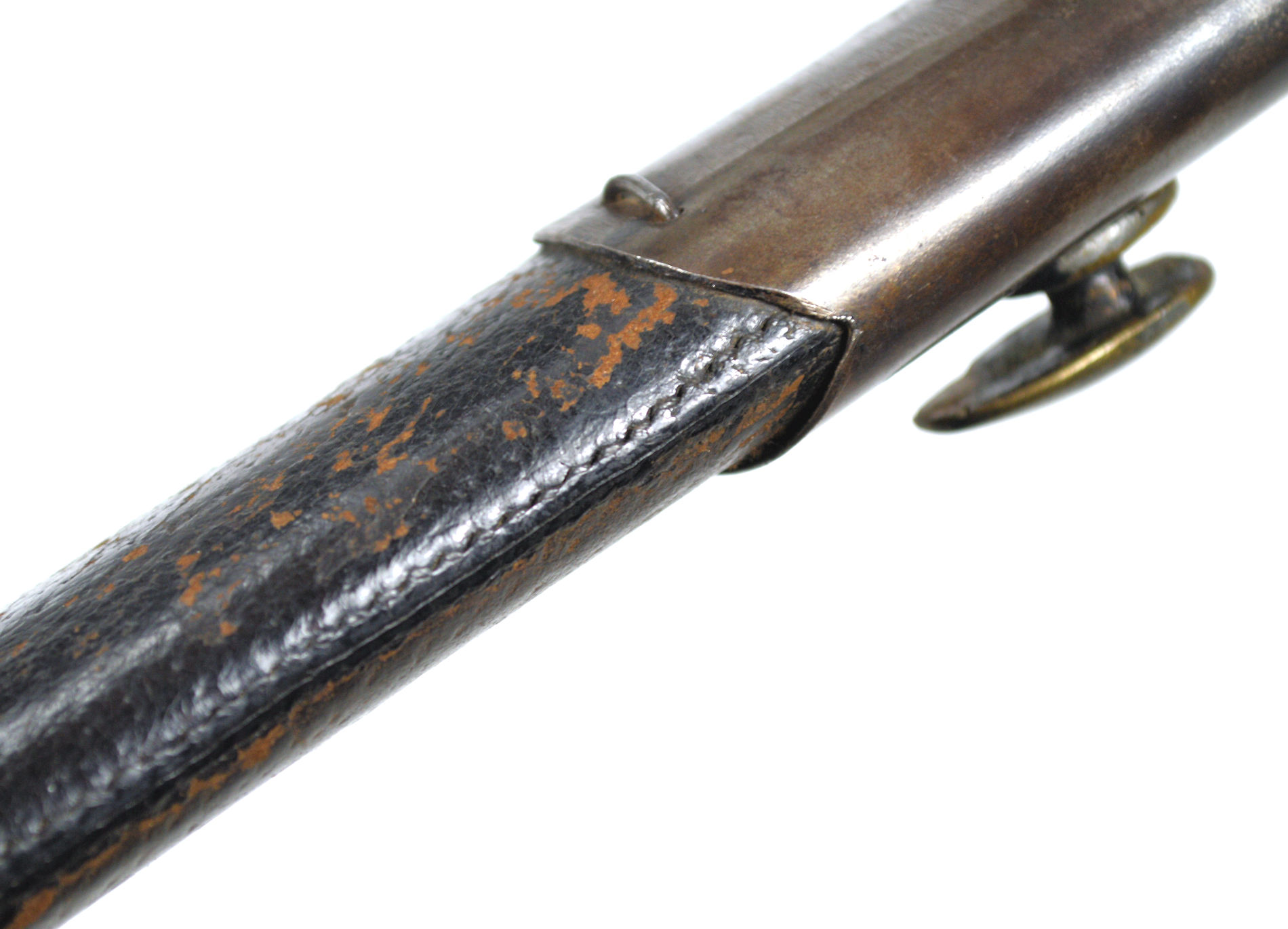 - A two-third size Volunteer sword bayonet. The crossguard and pommel cast in gunmetal, with checkered leather grips. Muzzle ring inside diasmeter 19.5mm, and the recurved yataghan blade length 471mm.