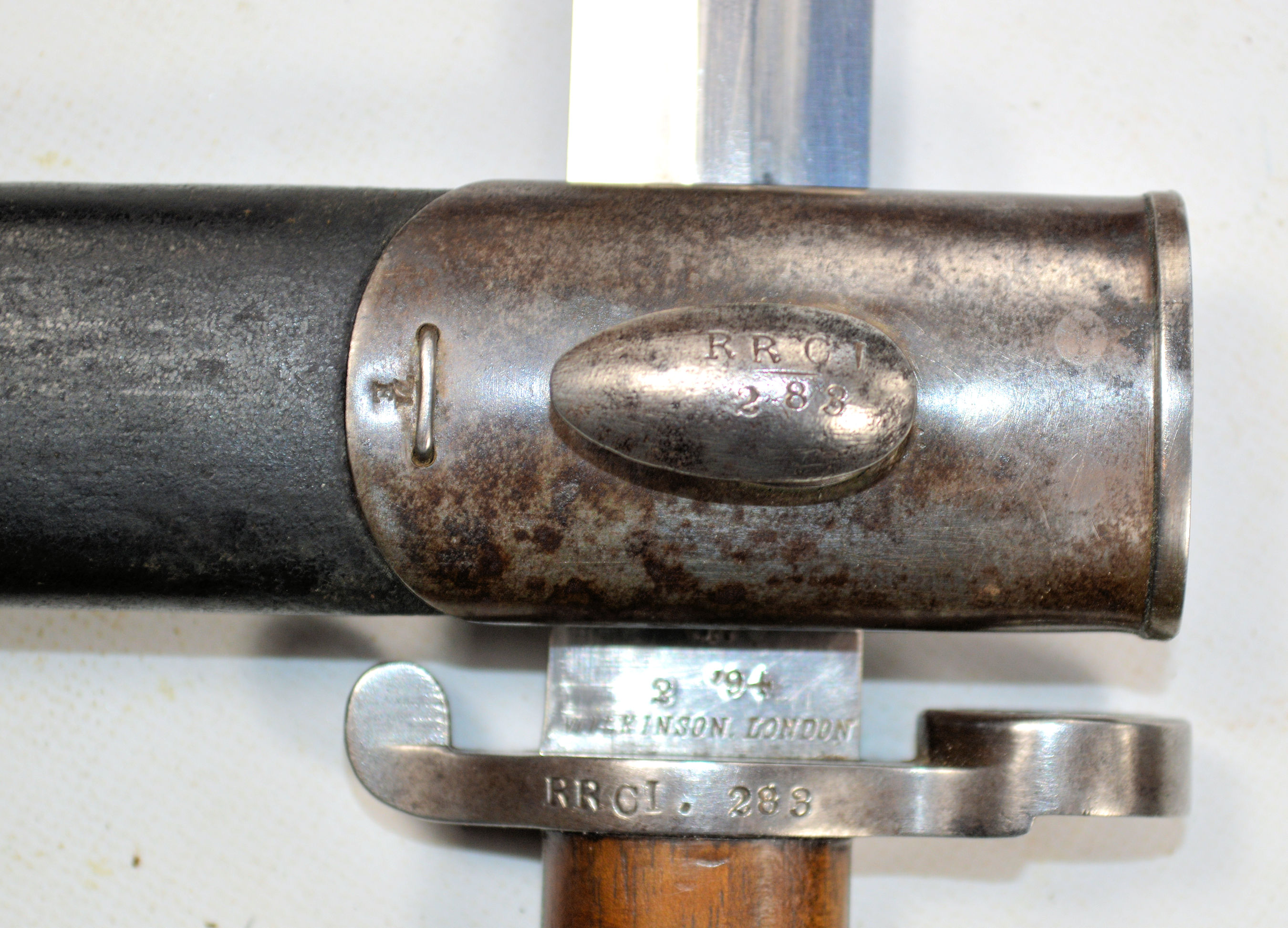 - A Canadian issued P1893 bayonet and scabbard with matching numbers to the RRCI. For a fully detailed account, visit here.