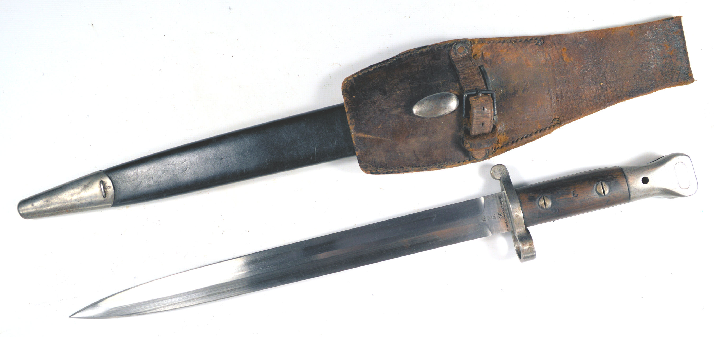 - A good clean example of a P1888 Mk.III bayonet by Sanderson of Sheffield and dated February 1903. Complete with a Mk.I scabbard and a General Service brown leather frog.